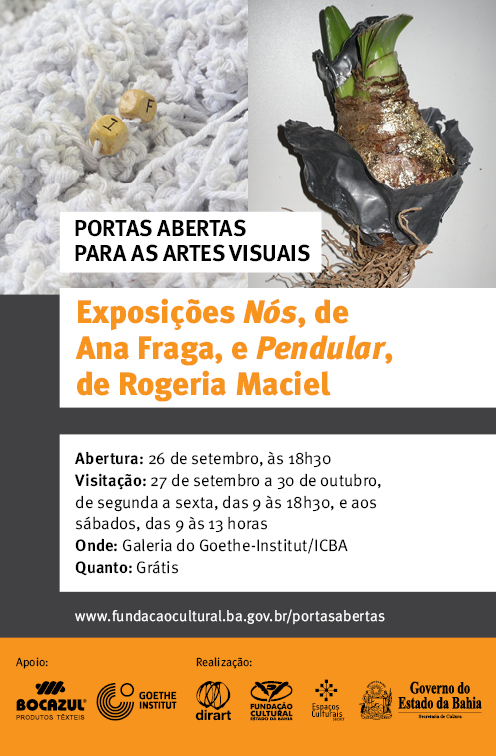 No dia 26 de setembro (sexta-feira), às 18h30, na Galeria do Goethe-Institut/ICBA (Corredor da Vitória), ocorrerá a abertura das exposições Nós, da artista visual Ana Fraga, e Pendular, de Rogeria Maciel. Parte integrante da pesquisa realizada pelas artistas no mestrado de Artes Visuais em Processos Criativos da Universidade Federal da Bahia (UFBA), as mostras se unem em visitação que seguirá até 30 de outubro, de segunda a sexta, das 9h00 às 18h30, e aos sábados, das 9h00 às 13h00, com entrada franca. Os dois projetos foram selecionadas no edital Portas Abertas para as Artes Visuais 2013, promovido pela Fundação Cultural do Estado da Bahia (FUNCEB), entidade vinculada à Secretaria de Cultura do Estado da Bahia (SecultBA). Nós, de Ana Fraga, surgiu da denominação regionalista “nós pelas costas”. De acordo com a nomeação, alguém “cheio de nós pelas costas” tende a ser uma pessoa cheia de manias, sistemático, metódico e que assume uma postura pouco acessível. Redefinindo esse conceito a partir da própria estranheza, do assombro daquilo que é desconstrução e vazio, a obra é integrada pelo ato compulsivo e diário de laçar a linha, formando um nó. O trabalho objetiva resumir uma investigação realizada pela artista, baseada nas experiências performáticas desenvolvidas em seu ateliê. Para isto, serão utilizados mais de 200 mil metros de linha barbante na cor branca e 5 milhões de nós, que há um ano estão sendo construídos manualmente por ela e a comunidade, com os quais Ana vai preencher um espaço 12m². Durante a exposição, a artista estará sentada em uma cadeira, fazendo nós até que o último carretel de linha se acabe. Já a exposição Pendular, de Rogeria Maciel, tem curadoria de Eriel Araújo e se dá a partir de cinco obras: Ciclo, feita por meio de apropriação de bulbos naturais de lírio, com aplicações de folhas de ouro e chumbo; Calibre 38, flores confeccionadas pelas internas de uma instituição carcerária, em retalhos de chumbo; Agudos, inspirada em pavios de candeeiros encontrados nas feiras livres de algumas cidades do interior do Brasil; Lâminas, uma série de gravuras sobre chumbo, que arrisca pensar os nossos próprios limites; e Recônditos, formas orgânicas feitas em fitas de chumbo, trançadas como em cestarias e que acomodam em seus interiores folhas e flores desidratadas. As obras pretendem resgatar a arte como experiência do sensível e buscam a delicadeza da transformação, as vivências cotidianas das sociedades e da natureza através de um olhar afetivo. Portas Abertas para as Artes Visuais 2013 – Com objetivo de apoiar a difusão da produção de Artes Visuais da Bahia, bem como dinamizar e qualificar a ocupação de espaços culturais públicos, o edital Portas Abertas para as Artes Visuais 2013 contabilizou 74 propostas inscritas, das quais 14 foram selecionadas: quatro de exposições a serem montadas na Galeria do Conselho, e dez de intervenções em Artes Visuais nos ambientes da Casa da Música, Centro Cultural Plataforma, Cine-Teatro Solar Boa Vista, Espaço Cultural Alagados e Espaço Xisto Bahia. Os trabalhos são de temática livre e levam aos espaços diferentes modalidades das artes visuais. Exposições Nós, de Ana Fraga, e Pendular, de Rogeria Maciel Abertura: 26 de setembro, às 18h30 Visitação: 27 de setembro a 30 de outubro Segunda a sexta, 9h00 às 18h30; sábados, 9h00 às 13h00 Onde: Galeria do Goethe-Institut/ICBA Av. Sete de Setembro, 1809, Corredor da Vitória – Salvador/BA Quanto: Grátis Site: Portas Abertas Apoio: Goethe-Institut/ICBA Realização: Dirart/ FUNCEB/ DEC/ Sudecult/ SecultBA