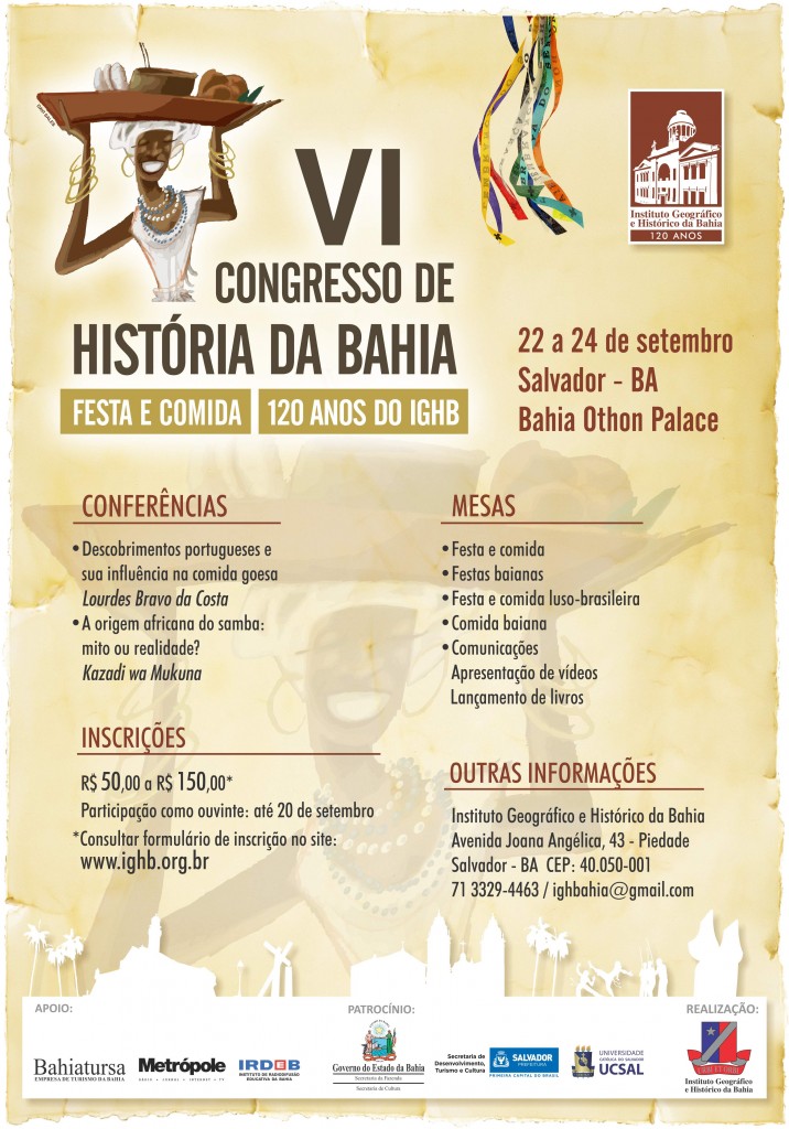 “Festa e Comida” é o tema central do VI Congresso de História da Bahia, que vai reunir trabalhos de mais de cinquenta pesquisadores e estudiosos da Bahia, do Brasil e do exterior, de 22 a 24 de setembro, no Bahia Othon Palace. O encontro integra as comemorações dos 120 anos de fundação do Instituto Geográfico e Histórico e conta com os patrocínios da Secretaria de Cultura do Estado, Secretaria de Desenvolvimento, Turismo e Cultura, da Prefeitura, UCSal, além do apoio da Bahiatursa, Rádio Metrópole e IRDEB. Durante o Congresso, presidido pela historiadora Consuelo Pondé de Sena e coordenado pela professora Maria Helena Flexor, serão discutidos temas sobre festas e comidas, típicas da Bahia, bem como de países que tiveram contato com os portugueses, com a proposta de resgatar essas tradicionais manifestações culturais. Entre os convidados estão a pesquisadora goesa Maria de Lourdes Bravo da Costa, que vai tratar do tema “Descobrimentos portugueses e a sua influência na comida goesa” e o professor congolês Kazadi wa Mukuna, que falará sobre “A origem africana do samba: mito ou realidade?”. Nas sessões de comunicações, previamente inscritas e selecionadas por uma Comissão específica, estarão em debate variados assuntos sobre o tema central, como as festas de São Nicodemus, São Sebastião, Nossa Senhora do Rosário, de Santana e Santa Bárbara, mascarados de Maragogipe, a festa dos vaqueiros de Curaçá, da Irmandade da Boa Morte, o Carnaval da Bahia, além dos festejos de futebol, ligados às celebrações das torcidas BA-VI. Como não poderia faltar comida, marcarão presenças: mitos da cozinha afro-brasileira, a feijoada, o pãozinho delícia, as culinárias sertaneja, do garimpo, de santo e dos índios e, é claro, o tradicional acarajé. Interessados em participar do evento podem se inscrever até o dia 20 de setembro, através do site do IGHB. Mais informações podem ser obtidas no telefone 71 3329 4463 e email: ighbahia@gmail.com Os Congressos: O primeiro Congresso de História da Bahia foi realizado em 1949, para comemorar os 400 anos de fundação da Cidade do Salvador. O segundo, em 1952, abordou a chegada do primeiro bispo do Brasil, D. Pero Fernandes Sardinha à Soterópolis. Em 1973, o tema da terceira edição foi a celebração dos 150 anos da Independência da Bahia. Só em 1999 teve vez do IV Congresso, comemorando os 450 anos da primeira capital do Brasil. No V Congresso, em 2001, os festejos estiveram voltados para os 500 anos da Baía de Todos os Santos. Sobre o IGHB: Fundado em 13 de maio de 1894, o Instituto Geográfico e Histórico da Bahia é a entidade cultural mais antiga do Estado. Também conhecido como a “Casa da Bahia”, possui a maior coleção de jornais, datados, desde o século XIX até a atualidade, além do maior acervo cartográfico do Estado, o que permite a sociedade conhecer a origem dos atuais 417 municípios baianos. Na Biblioteca Ruy Barbosa e Arquivo Theodoro Sampaio cerca de 30 mil títulos e coleções particulares estão à disposição de pesquisadores e demais interessados. No museu do IGHB há uma importante coleção de retratos, além de esculturas de bronze, mobiliário de época e peças religiosas da cultura africana na Bahia. A instituição é guardiã do Pavilhão 2 de Julho, que guarda o Caboclo e a Cabocla, comemorativo da Independência da Bahia. Fique atento: A inscrição para a participação do VI Congresso de História da Bahia deverá ser efetuada através do preenchimento do Formulário de Inscrição e pagamento da taxa. O comprovante do depósito bancário, devidamente identificado, deverá ser enviado para ighbahia@gmail.com. Dados para depósito: Instituto Geográfico e Histórico da Bahia Banco Itaú / Agência 0665 / Conta corrente 33982-6 CNPJ 14324800-0001-72 Programação - VI Congresso de História da Bahia Dia 22 – segunda-feira 8:00h – Recepção e credenciamento 8:30h – Abertura dos trabalhos Pronunciamentos: Consuelo Ponde de Sena - Presidente do IGHB Antônio Albino Canelas Rubim - Secretário de Cultura do Estado da Bahia Guilherme Bellintani - Secretário Municipal de Desenvolvimento, Turismo e Cultura José Euclimar Xavier de Menezes - Pró-Reitor de Pós-Graduação da UCSal 10:00h – Pausa para café 10:15h - 1ª Sessão de comunicações Ruy Medeiros – Festejos de Nossa Senhora das Vitórias em Vitória da Conquista: manutenção do mito fundacional Rita de Cássia Santana de Carvalho Rosado - A festa de São Nicodemus: padroeiro dos trabalhadores do porto de Salvador Coordenação: Maria Helena Ochi Flexor 11:00h – Mesa redonda 1 – Festa e comida espiritual Gabriel Frade – “Eis o pão dos anjos”: a Eucaristia cristã e seu desenvolvimento ao longo da história Antónia Fialho Conde – Dois ciclos solenes da liturgia católica aos quotidianos monásticos: a magia do açúcar nos espaços claustrais portugueses Coordenação: Ana Palmira Bittencourt S. Casimiro 12:00h – Almoço 14:00h – 2ª Sessão de comunicações Maria Conceição Barbosa da Costa e Silva – Uma festa na quadra natalina de 1760 Maria Eunice Rosa de Jesus – A festa de São Sebastião na comunidade do Mulungu: restabelecendo os laços de sociabilidade Ailton Batista da Silva – O banho de cachaça na imagem do Senhor dos Paços de Morro Vermelho: convergência entre patrimônio e imaterial Coordenação: Maria Conceição Barbosa da Costa e Silva 15:00h – 3ª Sessão de comunicações Ailton Batista da Silva – “A comida fala”. A culinária como elemento representativo e fundamental da festa da Irmandade de Nossa Senhora do Rosário dos Homens Pretos de Chapada do Norte de Minas Gerais Belinda Maria de Almeida Neves – Elementos do banquete antropofágico nos altares da igreja dos jesuítas em Salvador/BA Coordenador: Vanessa Brasil Campos Rodriguez 15:45h – Pausa para café 16:00h – Mesa redonda 2: Festas baianas Mariely Santana – Devoção, diversã