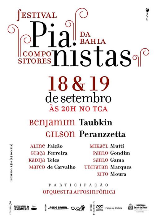 Acontece, nos dias 18 e 19 de setembro (quinta-feira e sexta-feira), na Sala Principal, o 1º Festival Pianistas Compositores da Bahia. Paulo Gondim, Ubiratan Marques, Saulo Gama, Aline Falcão, Graça Ferreira, Kadija Teles, Marco de Carvalho, Zito Moura e Mikael Mutti estarão no palco do Teatro Castro Alves, juntamente com dois grandes nomes do piano brasileiro: Benjamin Taubkin eGilson Peranzzetta, em homenagem ao piano e à maneira peculiar da Bahia fazer música. O festival terá ainda a participação da Orquestra Afro Sinfônica.