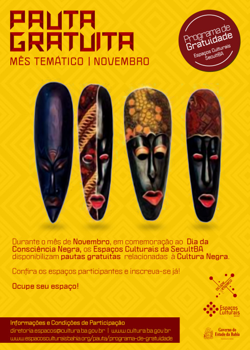 Novembro é mês de consciência, de luta, de cultura e de inigualável beleza. Para homenagear a cultura que encanta o mundo, tão presente e característica na Bahia, o programa de gratuidade de pauta da Diretoria de Espaços Culturais (DEC/Secult-BA) disponibiliza Pautas gratuitas para atividades vinculadas a cultura negra. O programa integra o Novembro Negro, uma série de atividades desenvolvidas pela Secretaria de Cultura do Estado há oito anos. O propósito é fortalecer ações de promoção da igualdade racial no mês de novembro, instituído como o mês da Consciência Negra. Neste período são celebrados o legado e a memória de Zumbi dos Palmares, herói sintetize da luta do povo baiano por uma sociedade livre e igualitária. Para solicitar a pauta gratuita é preciso entrar em contato com a coordenação do espaço cultural de interesse. Depois de verificada a disponibilidade de agenda, o proponente deve preencher o formulário do pedido de pauta e encaminhá-lo para a coordenação, com o prazo mínimo de 30 dias.  É recomendável, caso existam, o encaminhamento de informações e materiais adicionais, a exemplo de cópia de matérias publicadas na imprensa, fotografias, vídeos, programas, cartazes, dentre outros. Estes tipos de adicionais servem como complemento à proposta apresentada. A Pauta Gratuita faz parte do Ocupe seu Espaço – Programa de Dinamização de Espaços Culturais da Secult-BA.  O programa conta com diversas ações ao longo de todo o ano. Entre elas estão as programações temáticas; o Circuito Popular de Cinema e Vídeo (CPCV); a mediação e formação de platéia junto a escolas, organizações e comunidades; o Circuito de Festivais; o Credenciamento de Artistas; a requalificação de espaços; a política de acesso, com ingressos gratuitos ou a baixo custo; e os encontros da classe artística e produtores locais. SERVIÇO Pauta Gratuita – Mês Temático (novembro) Inscrições Abertas: Informações: diretoria.espacos@cultura.ba.gov.br /www.espacosculturaisbah