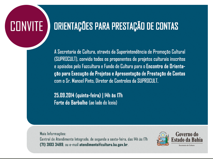 No próximo dia 25, das 14h às 17h, proponentes de projetos culturais inscritos e apoiados pelo Fazcultura e Fundo de Cultura poderão participar da palestra presencial sobre Orientação para Execução de Projetos e Apresentação de Prestações de Contas, no Forte do Barbalho, em Salvador. A palestra será proferida pelo diretor de Acompanhamento e Controles da Superintendência de Promoção Cultural (Suprocult) da Secretaria de Cultura do Estado da Bahia (SecultBA), Manoel Pinto. Responsável pelas análises das prestações de contas dos projetos apoiados pela SecultBA, o diretor Manoel Pinto esclarecerá dúvidas sobre os procedimentos de prestação de contas em relação aos vários aspectos da execução dos Projetos do Fundo de Cultura e do Fazcultura, com base na legislação vigente. O evento destina-se aos proponentes de projetos em execução e a serem iniciados, bem como àqueles potenciais proponentes de futuros projetos, além de eventuais participantes da execução e da elaboração da prestação de contas dos projetos. O encontro, além de orientar sobre a apresentação da Prestação de Contas, no que se refere ao preenchimento dos formulários pertinentes, relatório de atividades, material de divulgação e apresentação de material adequado que comprove o cumprimento do Marco Executivo e/ou a execução do projeto, abrangerá temas, como movimentação da conta corrente; comprovantes de despesas; incidência de impostos; cotações de preços; remanejamentos de orçamento; prorrogações de prazo. Em 2014 acontecerão ainda mais duas palestras: uma videoconferência no Instituto Anísio Teixeira (IAT), em 29/10, e a última do ano, em 27/11, presencial, no Forte do Barbalho. As videoconferências também serão veiculadas para as cidades de Guanambi, Vitória da Conquista, Ibotirama, Paulo Afonso, Alagoinhas, Ilhéus, Pintadas, Amargosa, Irecê, Piritiba, Barreiras, Itaberaba, Ribeira do Pombal, Bom Jesus da Lapa, Itabuna, Salvador, Santo Amaro, Brumado, Itapetinga, Santo Antônio de Jesus, Caetité, Jacobina, Seabra, Cruz das Almas, Jequié, Senhor do Bomfim, Eunápolis, Juazeiro, Serrinha, Feira de Santana, Macaúbas, Teixeira de Freitas e Valença. O acesso às palestras é gratuito e aberto ao público. Participe! As palestras presenciais nas instalações do Forte do Barbalho acontecem em parceria com o escritório Bahia Criativa, fruto de convênio celebrado entre a SecultBA e o Ministério da Cultura (MinC). O local oferece atendimento e suporte a profissionais e empreendedores que atuam nos setores criativos, por meio de consultorias, assessoria técnica e capacitação profissional - sempre com foco na qualificação da gestão de projetos e negócios criativos. SERVIÇO O quê: Palestra de Orientação para Execução de Projetos e Apresentação de Prestações de Contas – com Manoel Pinto, Diretor de Acompanhamento e Controles da Suprocult/SecultBA. Quando: 25 de setembro (quinta-feira), das 14h às 17h. Local: Forte do Barbalho (71 3117-1446) Acesso gratuito e aberto ao público.