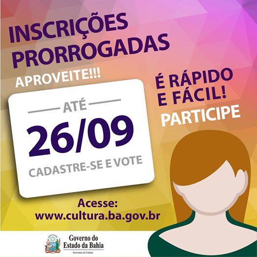 Representantes e cidadãos vinculados à comunidade cultural baiana têm mais uma semana para participar da etapa inicial do processo de decisão dos membros dos Colegiados Setoriais de Cultura da Bahia. A Secretaria de Cultura do Estado da Bahia prorrogou, até 26 de setembro de 2014, o cadastramento de eleitores e candidatos para os colegiados. A portaria que estabelece o novo prazo foi publicada na edição do fim de semana (20-21), do Diário Oficial do Estado. Os novos colegiados, dez ao total, vão representar os setores de: Arquivos e memória, Bibliotecas, Culturas Afrobrasileiras, Culturas Indígenas, Culturas Populares, Design, Livro e leitura, Moda, Museus, e Patrimônio. O cadastramento é aberto a pessoas físicas, maiores de 18 anos, residentes no estado da Bahia e atuantes na área cultural do setor, através de plataforma virtual disponível no site da SecultBA. Em parceria com a sociedade civil, estão diretamente comprometidas com as eleições dos colegiados setoriais a Fundação Pedro Calmon (FPC), o Instituto do Patrimônio Artístico e Cultural da Bahia (IPAC), o Centro de Culturas Populares e Identitárias (CCPI), e a Superintendência de Promoção da Cultura (SUPROCULT). Cada Colegiado Setorial de Cultura será individualmente composto por nove membros, sendo três do poder público, escolhidos pelo Secretário de Cultura, e seis da sociedade civil, eleitos através deste processo participativo. Para participar das eleições, como eleitor ou como candidato, é necessário estar devidamente cadastrado. Não podem participar detentores de cargo comissionados da administração pública federal, estadual, distrital ou municipal, nem funcionários públicos da SecultBA ou de suas vinculadas. Para que a eleição de um colegiado se efetive, deve haver no mínimo 30 cadastros validados, sendo pelo menos 12 candidatos, que concorrerão às seis vagas de titulares e seis vagas de suplentes. Cadastramento de eleitores e candidatos Eleição dos Colegiados Setoriais de Cultura da Bahia Arquivos e memória | Bibliotecas | Culturas Afrobrasileiras | Culturas Indígenas | Culturas Populares | Design | Livro e leitura | Moda | Museus | Patrimônio Quando: até 26 de setembro de 2014 Onde: Através de sistema on line disponível em www.cultura.ba.gov.br