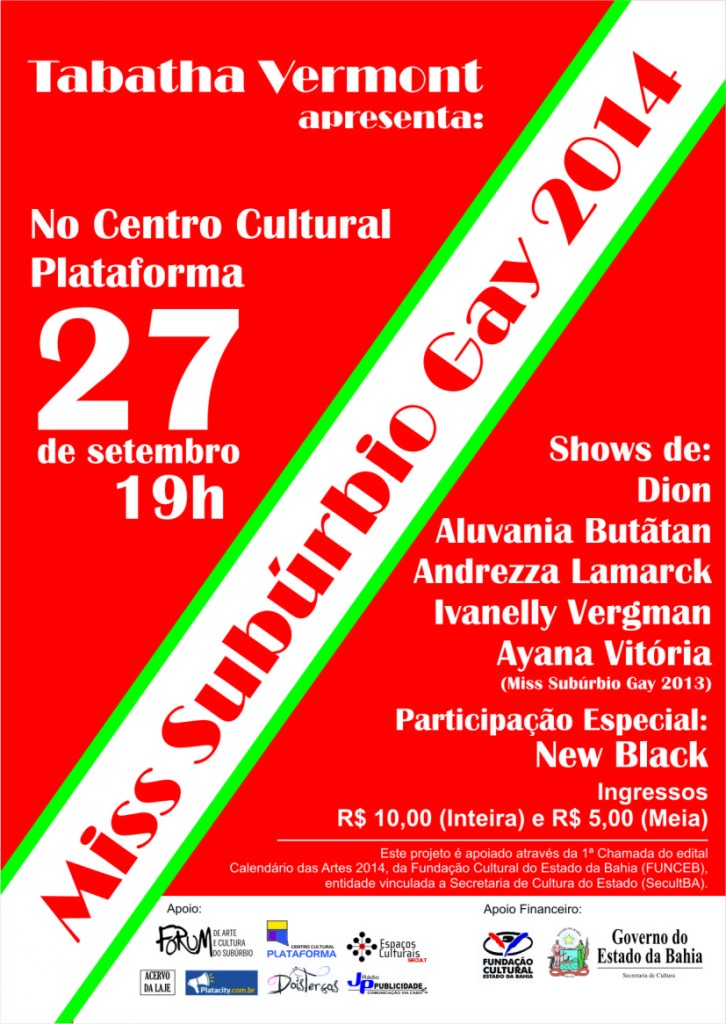 Luxo, glamour, elevação de autoestima e sensação de pertencimento: estes são os ingredientes da segunda edição do Miss Subúrbio Gay, que acontecerá neste sábado, 27 de setembro, às 19 horas, no Centro Cultural Plataforma, no subúrbio de Salvador. Os ingressos custam R$ 10 (inteira) e R$ 5 (meia). Fabrício Cumming assina a produção da atividade e sua personagem, a Condessa Tabatha Vermont, será a mestre de cerimônia. O evento encerra o Festival Diversas Suburbanidades, que, desde o dia 23, está promovendo diversas atividades no local, como exposição, exibição de filmes, vídeo-performance e bate-papos, tudo em torno da temática LGBT. O projeto tem apoio da Fundação Cultural do Estado da Bahia (FUNCEB), entidade vinculada à Secretaria de Cultura do Estado da Bahia (SecultBA), através do edital Calendário das Artes. Com a proposta de transformar-se numa vitrine da arte que é produzida no subúrbio soteropolitano, além do tradicional desfile das misses, textos de Perinho Santana, poeta de Plataforma, serão lidos pelas concorrentes. A trilha sonora será assinada pelo DJ e rapper Álvaro Réu. A noite ainda vai contar com as performances do grupo de dança New Black, shows de Dion, Ivanelly Vergman, Andressa Lamarck, Aluvania Butantã e Ayana Vitória (Miss Subúrbio 2013). A vencedora receberá, além das tradicionais faixa e coroa, um exclusivo troféu desenvolvido por Ray Bahia, artista plástico de Periperi. Da Baixa do Fiscal a São Tomé de Paripe e Ilhas, o subúrbio será representado pelas mais belas transformistas da região. O processo começa com a seleção das candidatas a partir das inscrições no site ou fanpage do evento. Serão selecionadas dez candidatas, entre as quais será escolhida a que representará o Subúrbio em ações LGBT na cidade de Salvador. Ainda para valorizar as belezas naturais e potencializar as ações culturais do subúrbio, um passeio de trem será feito com as concorrentes. Neste dia, será gravado um vídeo que vai ser exibido no dia da cerimônia. Sobre o Calendário das Artes – Mecanismo de incentivo a projetos artísticos e culturais de pequeno porte na Bahia, o Calendário das Artes objetiva estimular o desenvolvimento das artes no estado. Concedendo prêmios de até R$ 13 mil, abrange as áreas de Artes Visuais, Audiovisual, Circo, Dança, Literatura, Música, Teatro e Artes Integradas. São priorizadas propostas oriundas e/ou realizadas em benefício de populações com menor acesso a produtos culturais e que privilegiam a diversidade cultural. O certame se fundamenta na acessibilidade e ampliação do investimento na produção artística de toda a Bahia, incluindo premissas que buscam abarcar propostas de todas as regiões do estado em quantidade igualitária: a avaliação dos projetos é feita de forma territorializada e os inscritos de cada Macroterritório da Bahia concorrem apenas entre si. Lançado em 2012, o Calendário das Artes, somando as suas cinco Chamadas já concluídas, disponibilizou um total de R$ 3,016 milhões para a execução de 233 projetos, selecionados dentre um total de 4230 inscritos, e oriundos de 99 municípios, contemplando todos os 27 Territórios de Identidade do estado. Ainda serão anunciados os resultados da 2ª Chamada de 2014, que encerrou inscrições no último dia 27 de agosto. Mais informações em FUNCEB/Calendário das Artes. Miss Subúrbio Gay | Festival Diversas Suburbanidades Onde: Centro Cultural Plataforma Quando: 27 de setembro (sábado), 19h Classificação: 14 anos Quanto? R$ 10 (inteira) / R$ 5 (meia) Informações: www.misssuburbiogay.com.br | misssuburbiogay@gmail.com 71 9265-7867 / 8862-7981 Fabricio Cumming (Produtor) 8691-1358 Leandro Souza (Produtor) Apoio financeiro: Calendário das Artes/ FUNCEB/ SecultBA