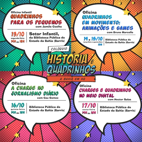 As oficinas terão como temas “Quadrinhos para os pequenos”, com Jamile Coelho, “Quadrinhos em movimento: animações e games”, com Bruno Marcello, “Quadrinhos no meio digital” por Hector Salas e “A charges no jornalismo diário” ministrada por CAu GomeZ. Os encontros acontecerão de 13 a 17/10, das 15h às 18h e as inscrições serão feitas no no site da Biblioteca Virtual 2 de Julho.