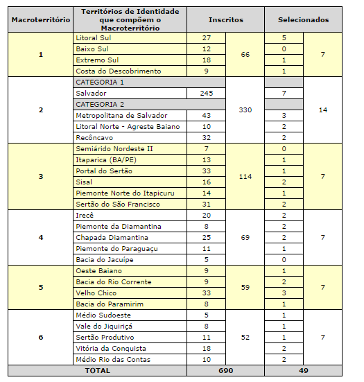 NÚMERO DE INSCRITOS E SELECIONADOS POR MACROTERRITÓRIOS E TERRITÓRIOS DE IDENTIDADE