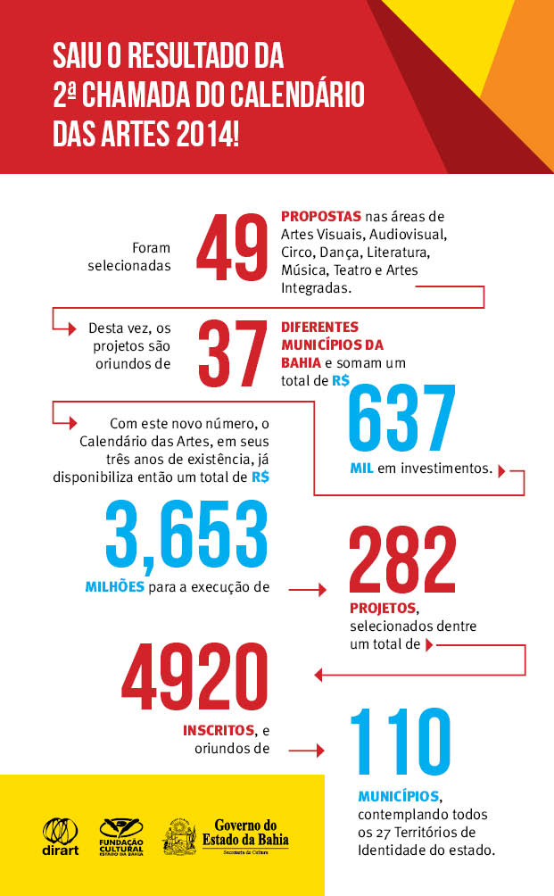 A Fundação Cultural do Estado da Bahia (FUNCEB), entidade vinculada à Secretaria de Cultura do Governo do Estado da Bahia (SecultBA), anuncia o resultado da 2ª Chamada do Calendário das Artes 2014, mecanismo de incentivo a projetos artísticos e culturais de pequeno porte na Bahia, que objetiva estimular o desenvolvimento das artes no estado. Os projetos apoiados vão ser iniciados entre os dias 1º de dezembro de 2014 e 28 de fevereiro de 2015. De 690 propostas inscritas, 49 foram selecionadas, nas áreas de Artes Visuais, Audiovisual, Circo, Dança, Literatura, Música, Teatro e Artes Integradas. São projetos oriundos de 37 diferentes municípios e, com este novo número, o edital, em seus três anos de existência, alcança uma lista de 110 municípios contemplados em todos os 27 Territórios de Identidade baianos. O resultado final, bem como informações detalhadas acerca do Calendário das Artes, estão disponíveis no site FUNCEB/Calendário das Artes. Com aporte financeiro total de R$ 637 mil, o Calendário das Artes concede prêmios de até R$ 13 mil. O edital se fundamenta na acessibilidade e ampliação do investimento na produção artística de toda a Bahia, considerando sua grande diversidade e dimensões territoriais. São priorizadas propostas oriundas e/ou realizadas em benefício de populações com menor acesso a produtos culturais e que privilegiam a diversidade cultural, contemplando as mais diversas ideias de artistas, grupos e produtores, amadores ou profissionais. Desta vez, serão dez projetos de Artes Integradas, nove de Música, oito de Teatro, sete de Audiovisual, cinco de Circo, cinco de Dança, três de Artes Visuais e dois de Literatura, iniciando suas ações nos próximos meses, abrangendo 24 Territórios de Identidade do estado. Lançado em 2012, tendo tido duas Chamadas por ano, o Calendário das Artes, somando as seis Chamadas realizadas, já disponibiliza então um total de R$ 3,653 milhões para a execução de 282 projetos, selecionados dentre um total de 4920 inscritos. As suas premissas buscam abarcar propostas de todas as regiões do estado em quantidade igualitária, com avaliação dos projetos feita de forma territorializada e com os inscritos de cada Macroterritório da Bahia concorrendo apenas entre si. O Calendário ainda divide o Macroterritório 2 em duas categorias: 1) propostas oriundas de Salvador; e 2) propostas oriundas dos demais municípios do Macroterritório 2. Assim, atende à maior demanda oriunda da capital e garante maior competitividade das propostas dos outros municípios desta região. As comissões de seleção são específicas para cada Macroterritório e formadas, além de membros do Estado, por representantes locais e de diferentes origens dentro do estado, escolhidos através de consulta pública e a entidades artísticas e culturais das diferentes regiões. Lista das 110 cidades baianas com projetos apoiados pelo Calendário das Artes nas seis Chamadas realizadas em seus três anos: Abaré, Água Fria, Alagoinhas, Amargosa, Amélia Rodrigues, Antônio Cardoso, Araci, Barreiras, Belmonte, Bom Jesus da Lapa, Buerarema, Cachoeira, Caetité, Cairu, Camaçari, Campo Formoso, Canavieiras, Cândido Sales, Cansanção, Capela do Alto Alegre, Capim Grosso, Caravelas, Carinhanha, Casa Nova, Conceição do Coité, Correntina, Cruz das Almas, Dias D’Ávila, Euclides da Cunha, Feira de Santana, Gandu, Governador Mangabeira, Guanambi, Iaçu, Ibicoara, Ibipeba, Ibotirama, Igaporã, Ilhéus, Inhambupe, Ipiaú, Irecê, Itaberaba, Itabuna, Itacaré, Itajuípe, Itaparica, Itapetinga, Itarantim, Jacobina, Jaguaquara, Jequié, Juazeiro, Lafaiete Coutinho, Lapão, Lençóis, Livramento de Nossa Senhora, Macaúbas, Manoel Vitorino, Mansidão, Maraú, Muniz Ferreira, Nordestina, Nova Canaã, Nova Soure, Olindina, Oliveira dos Brejinhos, Palmeiras, Paratinga, Paulo Afonso, Pé de Serra, Pindaí, Pintadas, Planaltino, Porto Seguro, Prado, Quijingue, Rio de Contas, Salvador, Santa Bárbara, Santa Cruz Cabrália, Santa Maria da Vitória, Santa Terezinha, Santo Amaro, Santo Estevão, São Domingos, São Félix, São Félix do Coribe, São Francisco do Conde, São Gabriel, São Gonçalo dos Campos, Sátiro Dias, Seabra, Senhor do Bonfim, Serra do Ramalho, Serrinha, Serrolândia, Simões Filho, Sítio do Mato, Tanque Novo, Tapiramutá, Terra Nova, Ubaíra, Uruçuca, Valença, Varzedo, Vera Cruz, Vitória da Conquista, Wenceslau Guimarães e Xique-Xique.