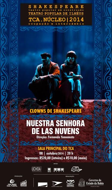 Como parte do intercâmbio previsto no Edital TCA.NÚCLEO 2014, o Teatro Popular de Ilhéus (TPI) – vencedor desta edição e que está realizando uma ocupação artística até o fim do ano no Complexo TCA – recebe na próxima semana o grupo Clowns de Shakespeare, do Rio Grande do Norte, que promove em Salvador a estreia nacional do seu mais novo projeto teatral: “Nuestra Señora de las Nuvens”, com apresentação única no dia 08 de outubro (quarta-feira), às 20h, na Sala Principal do TCA. Os ingressos custam R$ 20 (inteira) e R$ 10 (meia) e a lotação será reduzida, pois a peça será encenada com o público no palco. Os ingressos começam a ser vendidos nesta quinta-feira (02 de outubro). [caption id="attachment_52765" align="aligncenter" width="421" caption="Espetáculo Nuestra Senhora de las Nuvens - Foto Divulgação"]