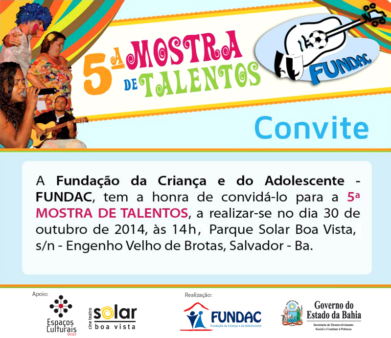 Mas antes que o mês acabe o pessoal da FUNDAC - FUNDAÇÃO DA CRIANÇA E DO ADOLESCENTE realiza a sua 5ª Edição Mostra de Talentos, no dia 30, a partir das 14h! O objetivo da Mostra é proporcionar aos colaboradores momentos de integração, aprendizagem, descontração e lazer, estabelecendo vínculos afetivos e de troca entre colegas e Unidades, fortalecendo sua auto-estima e ampliando a comunicação e interação social.