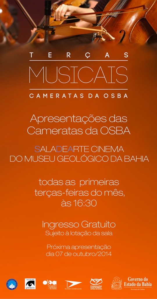As Cameratas também realizam ensaios abertos ao público, no piso B, sala 02 do TCA. Confira a programação completa das Cameratas em OUTUBRO: Quadro Solar Data: 07/10, às 16h30 Local: Saladearte Cinema do Museu (Museu Geológico da Bahia, Av. Sete de Setembro, 2195 – Vitoria) – Projeto Terças Musicais. Bahia Cordas Data: 09/10, às 15h Local: Escola Municipal Campinas de Pirajá (Estrada de Campinas, 2761 – Campinas de Pirajá). Bahia Cordas Data: 16/10, às 19h Local: Paróquia N. S. da Luz , Praça Wilson Lins, Pituba – “20ª Feira da Integração” Quarteto Novo Data: 21/10, às 15h Local: Centro Social Urbano de Valéria,  Rua Boca da Mata s/nº – Boca da Mata. Opus Lúmen Data: 24/10, às 14h30 Local: Centro Social Urbano de Pernambués – Grupo de Idosos Nova Vida (Rua Thomaz Gonzaga, 150 – Pernambués). Opus Lúmen Data: 24/10, às 15h30 Local: Colégio Aliomar Baleeiro , Rua Saturno, s/nº - Pernambués. Quadro Solar Data: 28/10, às 17h Local: Instituto Feminino da Bahia* (Politema). *XV Seminário de Integração Curso de  Museologia/Museus da Cidade do Salvador e o II Seminário de Pesquisa do Programa de Pós-Graduação em Museologia da UFBA Quarteto Novo Data: 30/10, às 15h Local: Escola Ricardo Pereira (Associação de Mulheres 08 de Março, Cazajeiras 8 – Comunidade Jardim das Mangueiras, Setor Próximo ao Mercado Milênio). ENSAIOS ABERTOS – CAMERATAS: Local: piso B, sala 02, do Teatro Castro Alves (Praça 02 de Julho – Campo Grande) Quarteto Novo – Dias 21 e 30 de outubro, às 8h. Bahia Cordas – Dias 09 e 16 de outubro, às 8h. Quadro Solar – Dias 06 e 27 de outubro, às 14h. Opus Lúmen – Dia 17 de outubro, às 14h30 e às 16h.