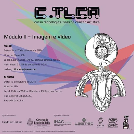 Estão abertas as inscrições para o segundo módulo do Curso Tecnologias Livres na Criação Artística (C.TLCA). As aulas acontecerão de 14 a 17 de outubro (terça a sexta), das 9h às 13h, na sala 303 do PAF IV, campus Ondina – UFBA. As inscrições são gratuitas e podem ser feitas até o dia 10/10 (sexta-feira), enquanto houver vagas.