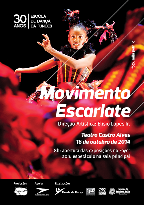 O ano de 2014 é muito especial para a Escola de Dança da Fundação Cultural do Estado da Bahia (FUNCEB), entidade vinculada à Secretaria de Cultura do Governo do Estado (SecultBA). Fundada em 1984, em Salvador, a primeira escola pública do gênero no Brasil está celebrando 30 anos de atividades. O marco da comemoração acontece no Teatro Castro Alves, no dia 16 de outubro, a partir das 18 horas, com abertura de uma exposição tripla – de fotos, figurinos e vídeos – no foyer, seguida, às 20 horas, do espetáculo Movimento Escarlate, no palco principal, com direção de Elísio Lopes Jr. O evento é aberto ao público, com entrada gratuita. “Em aniversário de 30 anos, o que dizer sobre a Escola de Dança? Uma palavra aflora com toda força: emoção. É emocionante ver suas vibrantes apresentações. É emocionante observar os familiares que trazem meninos e meninas de muitos e distantes territórios para suas aulas. É emocionante olhar esperanças e futuros sendo delicadamente tecidos. É emocionante acompanhar o trabalho inovador, criativo e dedicado dos membros da Escola de Dança. É emocionante ter a Escola de Dança”, reverencia Albino Rubim, secretário estadual de Cultura. Participarão das nove cenas que compõem o espetáculo de aniversário alunos e ex-alunos dos quatro grupos de cursos regulares oferecidos pela Escola: Curso de Educação Profissional Técnico de Nível Médio em Dança, para formação de bailarinos profissionais; Cursos de Formação Continuada em Dança, para qualificação de profissionais; Cursos Preparatórios, para a formação da criança e do adolescente durante toda a sua vida escolar; e os Cursos Livres, para adultos que querem praticar a dança. Companhias convidadas também vão estar no elenco. A apresentação será um recorte coreográfico da história da Escola e dos seus criadores, e seguirá a estrutura de um doc-dança, intercalando depoimentos de alunos, ex-alunos e professores sobre suas histórias de vida e suas memórias enquanto dançarinos, com trechos de coreografias novas e antigas. O palco e o figurino serão marcados pela cor vermelha, para representar o sistema nervoso, a circulação sanguínea, a energia do corpo e, principalmente, a paixão pela dança. Nehle Franke, diretora da FUNCEB, também notabiliza: “Comemorar os 30 anos da Escola de Dança da FUNCEB é dar provas da possibilidade de um projeto político continuado, em permanente evolução, apoiado pela sociedade e pelos agentes das artes – e a eles oferecido”, afirma. “A Fundação Cultural do Estado da Bahia, que também em 2014 celebra aniversário de 40 anos, abriga esta unidade com muita honra e tem nela toda a base pedagógica para os investimentos que vêm sendo feitos na área de educação artística”, completa Nehle. Fragmentos desta importante história estarão apresentados na exposição festiva, com expografia de Andrea May, que será montada em três seções no foyer do TCA: a fotográfica, com curadoria de Célia Aguiar, que contará com 40 fotos das atividades realizadas pela Escola nos últimos oito anos; a de figurinos, que reunirá vestimentas feitas com materiais reciclados, confeccionadas pelo coreógrafo Denny Neves e que apontam a estética da Escola de Dança na atualidade; e a de vídeos, com curadoria de Isabel Souza, na qual as pessoas poderão assistir às coreografias e apresentações realizadas a partir da década de 1990 pelos alunos da Escola. A mostra seguirá recebendo visitação até 3 de novembro. Diretora da Escola de Dança da FUNCEB desde 2007, Beth Rangel exalta: “É um prazer e um orgulho estar vivenciando e contribuindo como gestora-artista-educadora com o projeto político-pedagógico da Escola de Dança da FUNCEB. Pude comprovar que a formação em dança prescinde a formação de corpos-sujeitos, sejam de crianças ou jovens, competentes, criativos e críticos. Esta perspectiva projeta a Arte e a Educação como questões sociais e políticas prioritárias, com possibilidade de dar respostas a uma formação emancipatória da nossa sociedade brasileira”. OS 30 ANOS DA ESCOLA DE DANÇA DA FUNCEB – Condutora da criação da Escola de Dança da FUNCEB e primeira diretora da instituição, a professora e coreógrafa Lia Robatto destaca a estratégia utilizada na sua fundação: “Os objetivos, a metodologia, os conteúdos programáticos e os processos de aprendizagem foram definidos a partir do perfil do público-alvo, levando em consideração o aluno como sujeito, imprimindo uma ação formativa continuada com valores que ultrapassassem a própria dança, buscando uma articulação com os projetos de vida dos alunos”. Assumindo então o objetivo de refletir a identidade cultural da Bahia, além de reconhecer, valorizar e disseminar suas origens e diversidade, a Escola de Dança da FUNCEB atende, atualmente, mais de mil alunos por ano, de diferentes faixas etárias, em especial afrodescendentes, oriundos de escolas públicas e moradores de bairros populares. Alinhada às políticas dos Ministérios da Cultura (MinC) e da Educação (MEC), a Escola de Dança é também conveniada à Secretaria da Educação do Estado da Bahia. Desde 1990 com sede no Pelourinho, integra hoje a estrutura do Centro de Formação em Artes (CFA) da FUNCEB, criado em 2011. Entre os resultados desta trajetória, a Escola de Dança da FUNCEB já apresentou à sociedade baiana 25 turmas de novos profissionais de dança através do Curso de Educação Profissional Técnico de Nível Médio em Dança, que tem duração de dois anos e meio e é reconhecido pelo MEC. Estes alunos formados vêm contribuindo de muitas maneiras para a produtividade das artes cênicas da Bahia. Um exemplo é o atual coordenador de Dança da FUNCEB, Matias Santiago, que fez parte da primeira turma do curso aos 16 anos de idade: “Todo o meu trabalho como bailarino e como agente político dentro da área da dança foi plantado no momento 