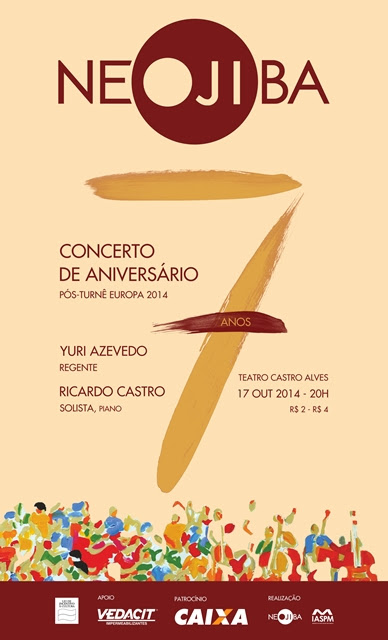 O Neojiba comemora 7 anos com um concerto especial dia 17 de outubro, no Teatro Castro Alves, às 20h. Yuri Azevedo, integrante do Neojiba, rege o concerto que terá como solista o diretor fundador do Programa, o maestro e pianista Ricardo Castro. A apresentação conta com a participação de músicos das orquestras Castro Alves e Pedagógica Experimental, além dos Núcleos CESA (Simões Filho), SESI (Itapagipe), Bairro da Paz e Estrelas Musicais (Nordeste de Amaralina).  Na ocasião será anunciado o Neojiba nos Bairros, projeto que realiza ações de capacitação e difusão do Neojiba em bairros com Bases Comunitárias de Segurança em Salvador e Região Metropolitana. Os ingressos estão à venda na bilheteria do TCA e também podem ser comprados online clicando aqui. Para mais informações, clique aqui. Não deixe de comemorar conosco os 7 anos de possibilidade de mudança na vida de crianças, adolescentes e jovens através da prática coletiva da música! Onde: Sala Principal do Teatro Castro Alves Quando: Sexta-feira, 17 de outubro; 20h Quanto: R$ 4 (inteira) e R$ 2 (meia)