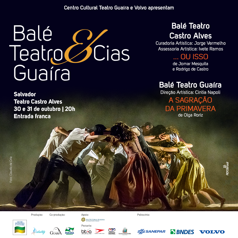 No total, o BTG fará apresentações em cinco cidades, além de Curitiba. Em novembro, as comemorações continuam, mas desta vez a cia será anfitriã. Durante quatro dias (de 13 a 16), o BTG recebe os grupos das cidades por onde passou, entre eles o próprio BTCA. Participam também do projeto, o Balé da Cidade de São Paulo, a Cia de Dança Palácio das Artes (Belo Horizonte), a Cia de Ballet da Cidade de Niterói (Niterói – RJ), o Corpo de Dança do Amazonas (Amazonas) e a G2 Cia de Dança (Curitiba). O projeto Balé Teatro Guaíra e Cias é uma realização da Lei de Incentivo à Cultura e conta com a produção da Associação de Bailarinos e Apoiadores do Balé Teatro Guaíra, coprodução do Centro Cultural Teatro Guaíra, apoio do Teatro Castro Alves e patrocínio da Companhia de Saneamento do Paraná (Sanepar), BNDES e Volvo. O espetáculo No primeiro momento, o Balé Teatro Castro Alves apresenta a montagem intitulada “...Ou Isso”, livremente inspirada na obra do poeta Manuel de Barros. A criação dos premiados coreógrafos Jomar Mesquita e Rodrigo de Castro e com direção artística de Jorge Vermelho, busca unir a poesia do escritor aos movimentos dos bailarinos, provocados pelo desafio de falar da reinvenção do olhar através da tradição da dança de salão. Depois de um intervalo de 10 minutos, o BTG apresentará o espetáculo “A Sagração da Primavera”, do compositor russo Igor Stravinksy, que subverteu a estética musical do século XX dando origem ao Modernismo. Junto da irreverente composição, a coreografia original de Vaslav Nijinski causou polêmica em sua época de estreia, na Paris de 1913, devido a sua natureza subversiva e teor provocativo. Em uma nova versão, com coreografia e figurino assinados por Olga Roriz, a obra centenária traz 20 bailarinos no palco e narra a trajetória de uma garota que seria entregue como oferenda ao Deus da Primavera, no auge de um ritual pagão, visando a boa colheita de seu povo. Para a diretora do Balé Teatro Guaíra, Cintia Napoli, “A Sagração da Primavera é um trabalho que mostra a sabedoria do protagonista, o Sábio, que conduz a força de todo o grupo diante do dilema da Eleita, que na versão de Olga, esta escolhida sente-se privilegiada por cumprir a função destinada a ela”. Cintia Napoli reforça ainda a importância da turnê nacional. “Entendemos que a melhor maneira para comemorar esta data é nos aproximarmos daqueles que admiram esta arte, seja com o público ou com nossos parceiros de ofício”, explica a diretora do Balé Teatro Guaíra, Cintia Napoli. O curador do BTCA e diretor artístico do espetáculo, Jorge Vermelho, também comemora. “O ponto alto deste encontro é poder discutir e refletir sobre as novas condições que se apresentam nesta maturidade no âmbito da Companhias Oficiais. Estar com o Guaíra, uma das primeiras Companhias, será muito significativo, pois assim poderemos dialogar sobre procedimentos artísticos e administrativos que o BTCA pode trocar com o BTG”, conta Jorge Vermelho. SERVIÇO: Balé Teatro Guaíra e Cias Balé do Teatro Castro Alves – ...Ou Isso Balé Teatro Guaíra – A Sagração da Primavera 30 e 31 de outubro Horário: 20h Local: Teatro Castro Alves - Praça Dois de Julho,s/n, Campo Grande, Salvador Ingressos gratuitos que podem ser retirados na bilheteria do TCA, a partir do dia 29. Serão liberados apenas dois ingressos, de cada dia, por pessoa. É necessária a apresentação do CPF. Informações: Bilheteria TCA (71) 2626-5071 PRÓXIMOS ESPETÁCULOS: 13 de novembro - Curitiba (PR) Balé Teatro Guaíra – A Sagração da Primavera Horário: 21h Local: Teatro Guaíra – Auditório Bento Munhoz da Rocha Netto – Rua Conselheiro Laurindo, s/nº Curitiba (PR) Informações: (41) 3304-7914 14 de novembro – Curitiba (PR) Cia. de Dança Palácio das Artes – Entre o Céu e as Serras Horário: 21h Local: Teatro Guaíra – Auditório Bento Munhoz da Rocha Netto – Rua Conselheiro Laurindo, s/nº Curitiba (PR) Informações: (41) 3304-7914 G2 Cia de Dança – Blow Elliot Benjamin Horário: 19h Local: Teatro Guaíra – Auditório Salvador de Ferrante - R. XV de Novembro, 971, Centro, Curitiba (PR) Informações:(41) 3304-7900 15 de novembro – Curitiba (PR) Balé da Cidade de São Paulo – Uneven, O Balcão de Amor (Duo), Abrupto. Horário: 21h Local: Teatro Guaíra – Auditório Bento Munhoz da Rocha Netto – Rua Conselheiro Laurindo, s/nº Curitiba (PR) Informações: (41) 3304-7914 Corpo de Dança do Amazonas – Sagração da Primavera Horário: 19h Local: Teatro Guaíra – Auditório Salvador de Ferrante - R. XV de Novembro, 971, Centro, Curitiba (PR) Informações:(41) 3304-7900 16 de novembro – Curitiba (PR) Companhia de Ballet da Cidade de Niterói – Romeu e Julieta Horário: 21h Local: Teatro Guaíra – Auditório Bento Munhoz da Rocha Netto – Rua Conselheiro Laurindo, s/nº Curitiba (PR) Informações: (41) 3304-7914 Balé Teatro Castro Alves - ...Ou Isso Horário: 19h Local: Teatro Guaíra – Auditório Salvador de Ferrante - R. XV de Novembro, 971, Centro, Curitiba (PR) Informações:(41) 3304-7900 22 e 23 de novembro - Niterói (RJ) Companhia de Ballet da Cidade de Niterói – Casa de Carii Balé Teatro Guaíra – A Sagração da Primavera Horário: 20h30 Local: Teatro Popular Oscar Niemeyer – Rua Jornalista Rogério Coelho Neto, s/n Niterói (RJ) Informações: (21) 2613 2734 INFORMAÇÕES SOBRE AS COMPANHIAS DE DANÇA BALÉ TEATRO GUAÍRA O Balé Teatro Guaíra foi criado em 1969 pelo Governo do Estado do Paraná. Durante todo seu percurso contou com importantes diretores e coreógrafos, acumulando mais de 130 coreografias realizadas. Teve como primeiros diretores Ceme Jambay, Yara de Cunto, Yurek Shablewski, Hugo Delavalle e Eric Waldo. Em 1979, o coreógrafo português Carlos Trincheiras assumiu a direção e permaneceu até 1993. Nesse período a companhia ganhou reconhecimento internacional, com des