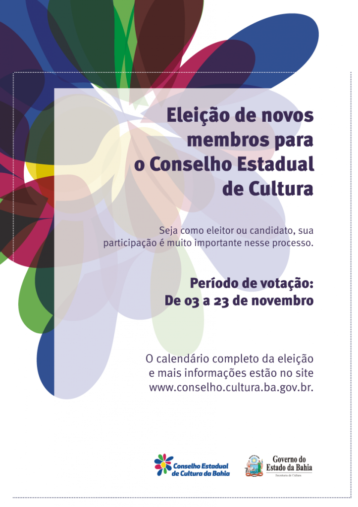 O processo eleitoral está previsto na Lei Orgânica da Cultura da Bahia (Lei 12.365), que determina a indicação dos conselheiros de cultura da sociedade por meio da eleição. Serão eleitos 20 conselheiros (10 titulares e 10 suplentes) para representar os setores culturais e os processos do fazer cultural da sociedade civil.