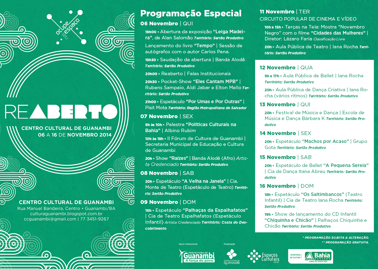 Programação* 06.11 (QUI) 19h - Abertura da exposição "Leiga Madeira", de Alan Salomão 19h30 - Saudação de abertura - Banda Alodê 20h - Reaberto | Falas Institucionais 20h30 – Pocket Show “Eles Cantam MPB” - Rubens Sampaio, Aldi Jabar e Elton Mello 21h - Espetáculo "Por Umas e Por Outras" - Pisit Mota 07.11 (SEX) 9h - Palestra "Políticas Culturais na Bahia" - Albino Rubim 10h - Fórum de Cultura de Guanambi - Secretaria Municipal de Educação e Cultura de Guanambi 20h - Show "Raízes" - Banda Alodê (Afro) 08/11 (SÁB) 20h - Espetáculo "A Velha na Janela" - Cia Monte de Teatro (Espetáculo de Teatro)| Território: Sertão Produtivo 09.11 (DOM) 16h – Espetáculo Infantil "Palhaças da Espalhafatos" - Cia de Teatro Espalhafatos 11.11 (TER) - Circuito Popular de Cinema e Vídeo (CPCV) 10h e 15h - Terças na Tela – Mostra "Novembro Negro" 20h - Aula Pública de Teatro - Iana Rocha 12.11 (QUA) 9h e 17h - Aula Pública de Ballet - Iana Rocha 20h - Aula Pública de Dança Criativa - vários ritmos - Iana Rocha 13.11 (QUI) 20h - Festival de Música e Dança - Escola de Música e Dança Bárbara K 14.11 (SEX) 20h - Espetáculo “Machos por Acaso” - Grupo Gota 15.11 (SAB) 20h - Espetáculo de Ballet "A Pequena Sereia"- Cia de Dança Itana Abreu 16.11 (DOM) 18h – Espetáculo Infantil "Os Saltimbancos” - Cia de Teatro Iana Rocha 19h - Show de lançamento do CD Infantil "Chiquinha e Chicão"- Palhaços Chiquinha e Chicão *Programação sujeita a alteração