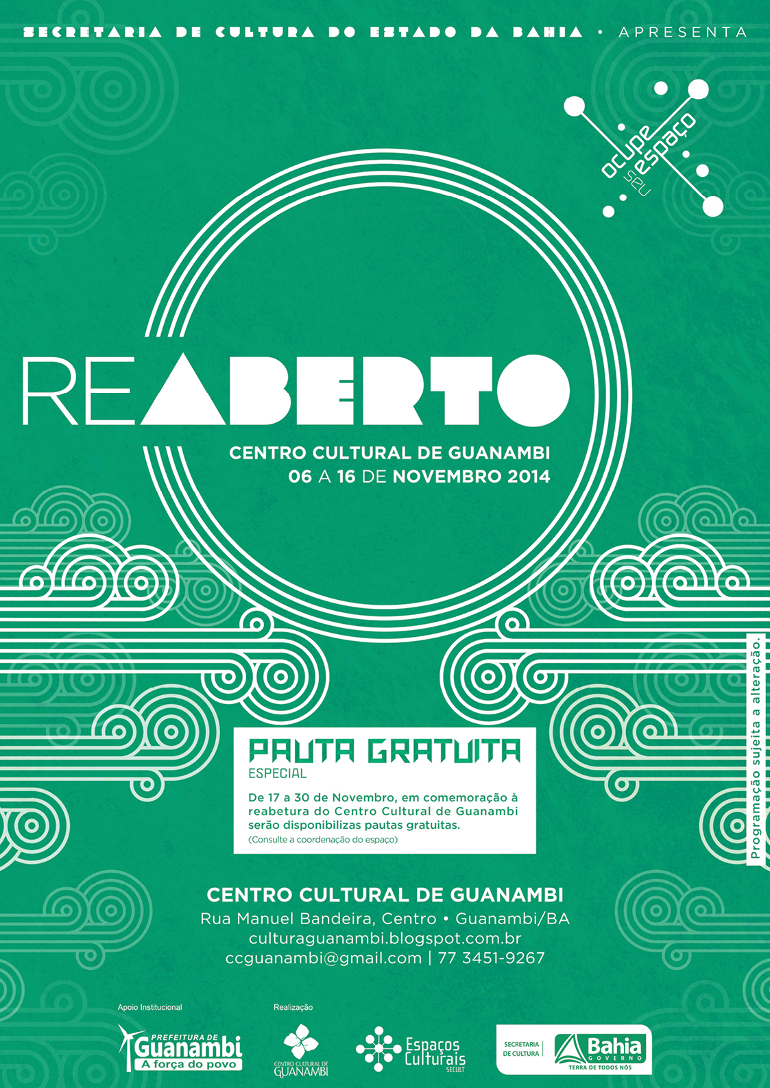 SERVIÇO REABERTO - Centro Cultural de Guanambi 6 a 16 de novembro 2014 (Rua Manoel Bandeira, s/n, Centro) Blog dos Espaços Culturais Informações sobre Pautas: 77 3451-9267ccguanambi@gmail.com