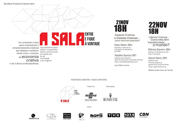 Nos dias 21 e 22 de novembro, a Benditas Projetos Criativos abre A SALA, uma experiência de compartilhamento de pensamentos e percepções sobre o universo da economia criativa e da cultura contemporânea. A cada edição, o projeto vai criar ambientes de reflexão e difusão de conhecimento, através de encontros entre empresários criativos, pensadores, especialistas, pesquisadores e público interessado. Estar em movimento é o conceito-chave desse projeto: mover o corpo, movimentar o pensamento, reposicionar-se, recolocar-se, deslocar-se. Mais do que ações, essas são algumas das provocações da proposta. Por isso, A SALA terá um caráter itinerante. A cada encontro, um espaço diferente. Em cada encontro, uma nova reflexão. O lançamento será no dia 21/11, às 18h, na loja Efeito Home, no Caminho das Árvores. O tema em pauta: Espaços Criativos e Cidades Criativas – como torná-los possíveis?, que vai contar com a participação de Naia Alban (BA), arquiteta e Diretora da Faculdade de Arquitetura da UFBA, e Natália Garcia (SP), jornalista especializada em planejamento urbano, criadora do Cidades para Pessoas, projeto viabilizado por financiamento coletivo, com o qual percorreu 12 destinos pelo mundo para tentar entender o que deixa as cidades mais humanas. No dia 22/11, às 18h, A SALA se monta no Restaurante Casa de Tereza, no Rio Vermelho, e o tema será Líderes Criativos – Como eles têm transformado o mundo?, quando estarão presentes Márcia Ganem (BA), gestora e estilista, presidente do Instituto de Design e Inovação (Indi), e David Hertz (SP), fundador da Gastromotiva, organização que vem utilizando a gastronomia como agente de mudanças e promovendo o Movimento da Gastronomia Social. A SALA conta com o patrocínio do SEBRAE, e o apoio da TVE/ Rádio Educadora FM, Rádio CBN Salvador, Loja Efeito Home, Restaurante Casa de Tereza, M2Soluções Audiovisuais, Navii Clipping Inteligente, Eliezer Nobre. Serviço: Onde: Loja Efeito Home (Rua do Timbó, 302 - Caminho das Árvores) e Restaurante Casa de Tereza (Rua Odilon Santos, 45 - Rio Vermelho). Quando: Dia 21/11, de 18h às 20h, na Efeito Home. Dia 22/11, de 18h às 20h, na Casa de Tereza. Quanto: gratuito Inscrições: As inscrições serão feitas pela internet, na plataforma Sympla. Encontro 01 - http://bit.ly/01aSala Encontro 02 - http://bit.ly/02aSala Realização: Benditas Projetos Criativos E-mail: benditasprojetoscriativos@gmail.com Contato/informações: Tatti Carvalho: (71) 9989-5404/ Andrea Gama:  (71) 9984-9330 Imprensa: Sofia Federico (71) 9907-6940 (para fotos em alta definição, solicitar pelo email benditasprojetoscriativos@gmail.com) Saiba mais sobre os convidados que estarão n’A SALA! Naia Alban (BA) - Possui graduação em Arquitetura pela Universidade Federal da Bahia (1985) e doutorado na Escuela Técnica Superior de Arquitectura de Madrid - Universidad Politécnica de Madrid (1994). Atualmente, é Diretora da Faculdade de Arquitetura da UFBA (2011), onde é professora desde 2001. Colaboradora do Sete43Arquitetura, escritório que recebeu o Prêmio de Melhor Obra de Arquitetura de Espaço Urbano com a PRAÇA TURCA, na VI Bienal Latino Americana de Arquitetura e Urbanismo, em Lisboa, 2008. Tem experiência na área de Arquitetura e Urbanismo, com ênfase em Teoria e História da Arquitetura e Urbanismo na Produção do Espaço Arquitetônico, atuando principalmente nos seguintes temas: arquitetura contemporânea, projeto arquitetônico, arquitetura doméstica e habitação social, arquitetura moderna e movimento moderno. Natália Garcia (SP) - jornalista especializada em planejamento urbano. Sua principal ferramenta de trabalho é uma bicicleta dobrável, a Dora, que usa para explorar espaços públicos urbanos. Criou o Cidades para Pessoas, projeto viabilizado por financiamento coletivo, com o qual percorreu 12 destinos pelo mundo para tentar entender o que deixa as cidades mais humanas. Definido como “uma rede de conteúdo e conexões urbanas”, o Cidades para Pessoas quer gerar repertório de boas ideias para melhorar cidades e deixá-las mais humanas. Márcia Ganem (BA) - Gestora e estilista, administradora de empresas, mestra em gestão social, presidente do Instituto de  Design e Inovação (Indi), a baiana Márcia Ganem vem se projetando internacionalmente pelo estilo inovador de fazer moda, misturando pedras e fibras recicladas. Em 2014, abriu a Casa de Castro Alves, espaço cultural localizado no bairro do Santo Antônio Além do Carmo, no Centro Histórico de Salvador. Comprado em 2002, o casarão do século XIX foi contemplado em 2008 em edital do IPAC para restauração de imóveis tombados e vem se firmando com um dos espaços mais criativos da cidade. David Hertz (SP) – Formado em Gastronomia pelo Senac Águas de São Pedro, com MBA em Gestão e Empreendedorismo Social pela FIA-USP, David Hertz foi nomeado em 2012 com o título de Young Global Leader pelo Fórum Econômico Mundial. Essa premiação internacional é concedida a empreendedores entre 30 e 40 anos, pela relevância dos seus projetos - no caso, o Gastromotiva - compromisso com a sociedade e potencial para moldar o futuro mundial. David também é membro da Ashoka, organização global que reconhece e investe em líderes sociais, e empreendedor Artemísia. Em 2009, recebeu o primeiro Prêmio Folha Empreendedor Social de Futuro, concedido pelo jornal Folha de São Paulo e Fundação Schwab.