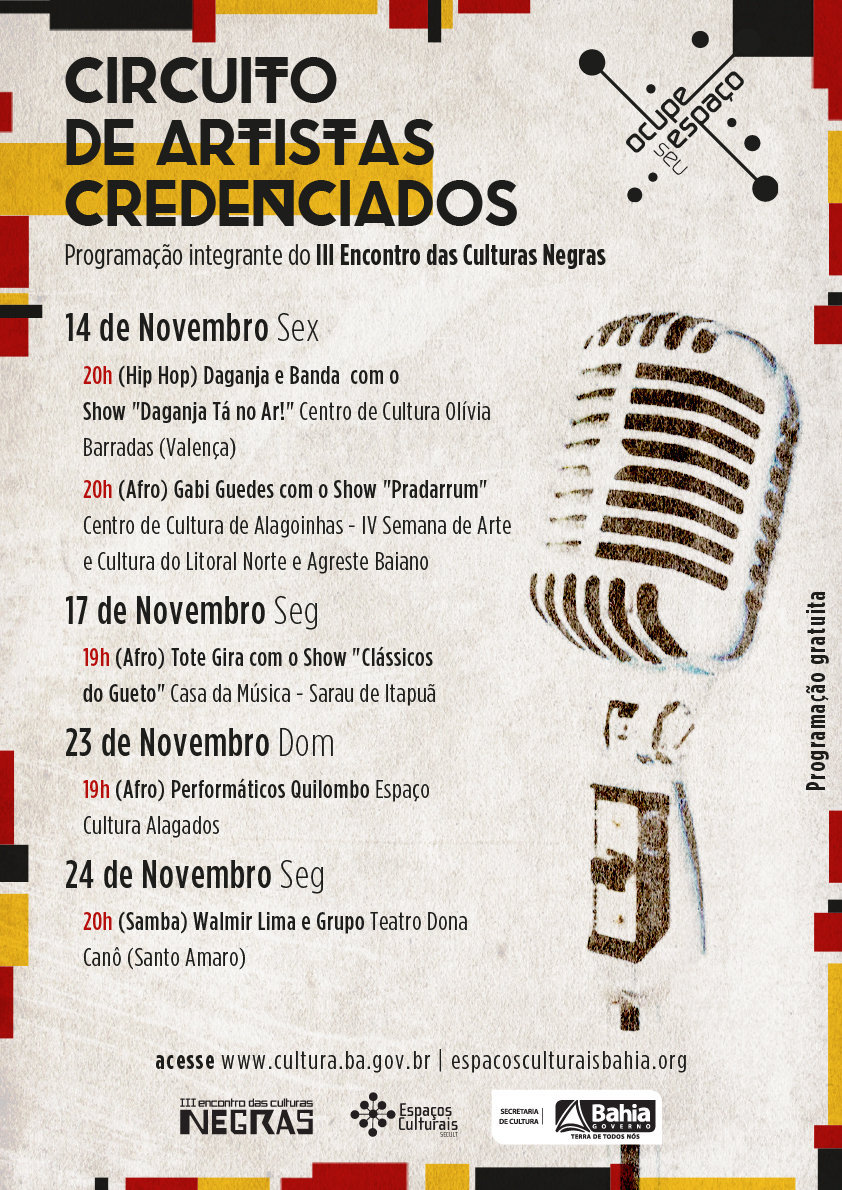 Os Espaços Culturais da Secretaria de Cultura do Estado da Bahia celebram o mês da Consciência Negra com programação especial. Além das consagradas ações que integram o III Encontro das Culturas Negras, este ano acontecerá pela primeira vez o Circuito de Artistas Credenciados, com o tema Culturas Negras. O evento, como o nome sugere, promove nos espaços culturais da capital e interior uma série de shows e espetáculos variados de artistas contemplados no edital de credenciamento realizado pela SecultBA em abril desse ano, cujo trabalho está vinculado a atividades de promoção das culturas negras. O roteiro do circuito, que passa pelo recém reaberto Centro Cultural de Guanambi e por dois festivais de grande importância territorial do estado: a Semana de Arte e Cultura do Litoral Norte e Agreste Baiano, em Alagoinhas, e a Semana da Consciência Negra, no Centro de Cultura de Porto Seguro. Este circuito tem o objetivo de ampliar a circulação e convocação dos credenciados, habilitados no processo de Credenciamento de Artistas, Grupos e Bandas dos Espaços Culturais da SecultBA, além de potencializar a programação já proposta pela Secretaria de Cultura do Estado no mês de novembro. O projeto integra o Novembro Negro, que reúne uma série de atividades desenvolvidas pelo Governo do Estado há oito anos, cujo propósito é de fortalecer ações de promoção da igualdade racial. Neste período são celebrados o legado e a memória de Zumbi dos Palmares, herói síntese da luta do povo brasileiro por uma sociedade livre e igualitária. PROGRAMAÇÃO 14 de Novembro - Daganja e Banda | Show "Daganja Tá no Ar!" | Centro de Cultura Olívia Barradas (Valença) | 20h00 (Hip Hop) - Gabi Guedes | Show "Pradarrum" | Centro de Cultura de Alagoinhas - IV Semana de Arte e Cultura do Litoral Norte e Agreste Baiano | 20h00 (Afro) 17 de Novembro Tote Gira | Show "Clássicos do Gueto" | Casa da Música - Sarau de Itapuã | 19h00 (Afro) 23 de Novembro Performáticos Quilombo | Espaço Cultura Alagados | 19h00 (Afro) 24 de Novembro Walmir Lima e Grupo | Teatro Dona Canô (Santo Amaro) | 20h00 (Samba)