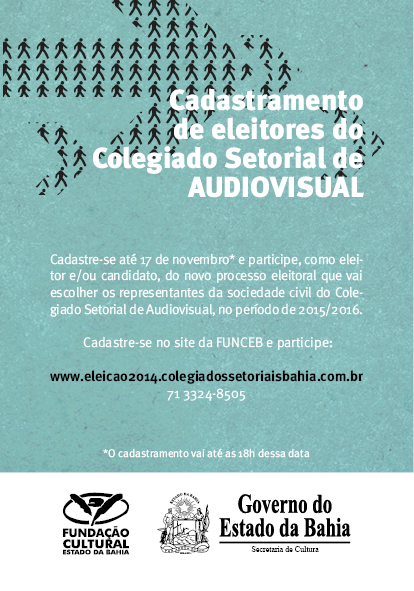 A Fundação Cultural do Estado da Bahia (FUNCEB), entidade vinculada à Secretaria de Cultura do Governo do Estado (SecultBA), convoca a comunidade do audiovisual baiano para o cadastramento de eleitores e candidatos que participarão das eleições do segundo mandato do Colegiado Setorial de Audiovisual da Bahia. O cadastro no sistema online Eleições 2014/ Colegiados Setoriais da Bahia, será feito até 17 de novembro, habilitando cidadãos para votar ou concorrer nas eleições, que ocorrerão de 26 de novembro a 5 de dezembro, também pela internet. A reabertura do processo, que já tinha sido realizado entre agosto e início deste mês e viabilizou as eleições dos colegiados dos demais setores artísticos, busca garantir a continuidade de atuação desta representação social para o audiovisual, que não obteve, no primeiro momento, o quórum mínimo de candidatos validados.