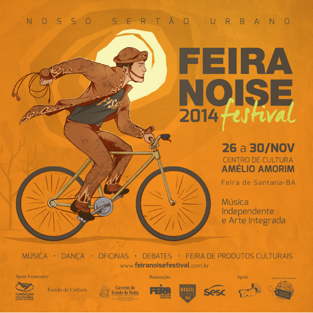 Entre os dias 26 e 30 de novembro de 2014, Feira de Santana recebe a quinta edição do Feira Noise Festival. O evento de artes integradas, realizado pelo Feira Coletivo, tem como objetivo oferecer espaço às produções de artistas independentes, discutindo formas eficazes de sustentabilidade através de uma articulação fundamental para quem constrói e vivencia a cena. O projeto é financiado pela Secretaria de Cultura do Estado da Bahia, através da Fundação Cultural do Estado da Bahia (FUNCEB), com recursos do Fundo de Cultura da Bahia (FCBA), pelo Edital Setorial de Música 2014. Esta edição do festival é realizada em parceria com o SESC- Feira de Santana e Rede Brasil de Festivais. A programação conta com 25 shows musicais, 10 apresentações de dança, 02 mesas redondas e ainda com a Feira de Produtos Culturais. Em 2014, para atingir um nível ainda mais alto de integração entre as artes, todas as atividades giram em torno de uma ideia-núcleo. Será explorado um conceito que diz muito sobre a diversidade do lugar onde o evento surgiu e se firmou: “Nosso sertão urbano”. Um sertão que é cosmopolita, um sertão de múltiplas cores, um sertão de árvores e concreto. Sertão do vaqueiro e do skatista, das carroças e dos carros do ano, do rock e do repente. Um sertão que, mesmo se distanciando tanto das representações mais óbvias, ainda não deixa de ser sertão. Assim é Feira de Santana. Essa fusão é algo que está na maneira de o Feira Coletivo pensar a cultura e agir como catalisador de produção cultural. É, portanto, a essência do Feira Noise, daí o porquê de merecer uma reflexão promovida pelo próprio festival. PROGRAMAÇÃO MUSICAL Quarta – 26/11 (abertura - entrada free) | 19h - Sergio Magno (FSA) - Alarde (SP) - Paulo Costa (FSA) - Toco Y Me Voy (SSA) Sexta – 28/11 | 18h - Roça Sound (FSA) - Limbo (Alagoinhas) - Sal (FSA) - Aeromoças e Tenistas Russas (SP) - Insert a Coin (FSA) - Coutto Orchestra (SE) - The Baggios (SE) - Canto dos Malditos na Terra do Nunca (SSA) Sábado – 29/11 | 15h - Roça Sound (FSA) - Grux (SSA) - Sexy Drivers (PE) - Irmão Carlos e o Catado (SSA) - Bruno Bezerra (FSA) - Novelta (FSA) - Scambo (SSA) - Clube de Patifes (FSA) - Dudé Casado (CE) - IFÁ Afrobeat (SSA) - Móveis Coloniais de Acaju (DF) Domingo – 30/11 | 15h - Roça Sound (FSA) - Human (FSA) - Canalhas Rock (FSA) - Psicordelicos (Irará) - Stephen Ulrich (FSA) - Dimme Roots (FSA) - Amiri (SP) - Banda Escola Pública (Cachoeira) - Las Taradas (Arg) - Diamba (SSA) Ingressos Balcões da Aqi Ingressos do Boulevard e do Arnold | Site Ingressos individuais (valor único promocional): R$ 15 Passaporte (valor único promocional - somente pela internet): R$ 35 Mais informações no site do Festival Noise Facebook do evento