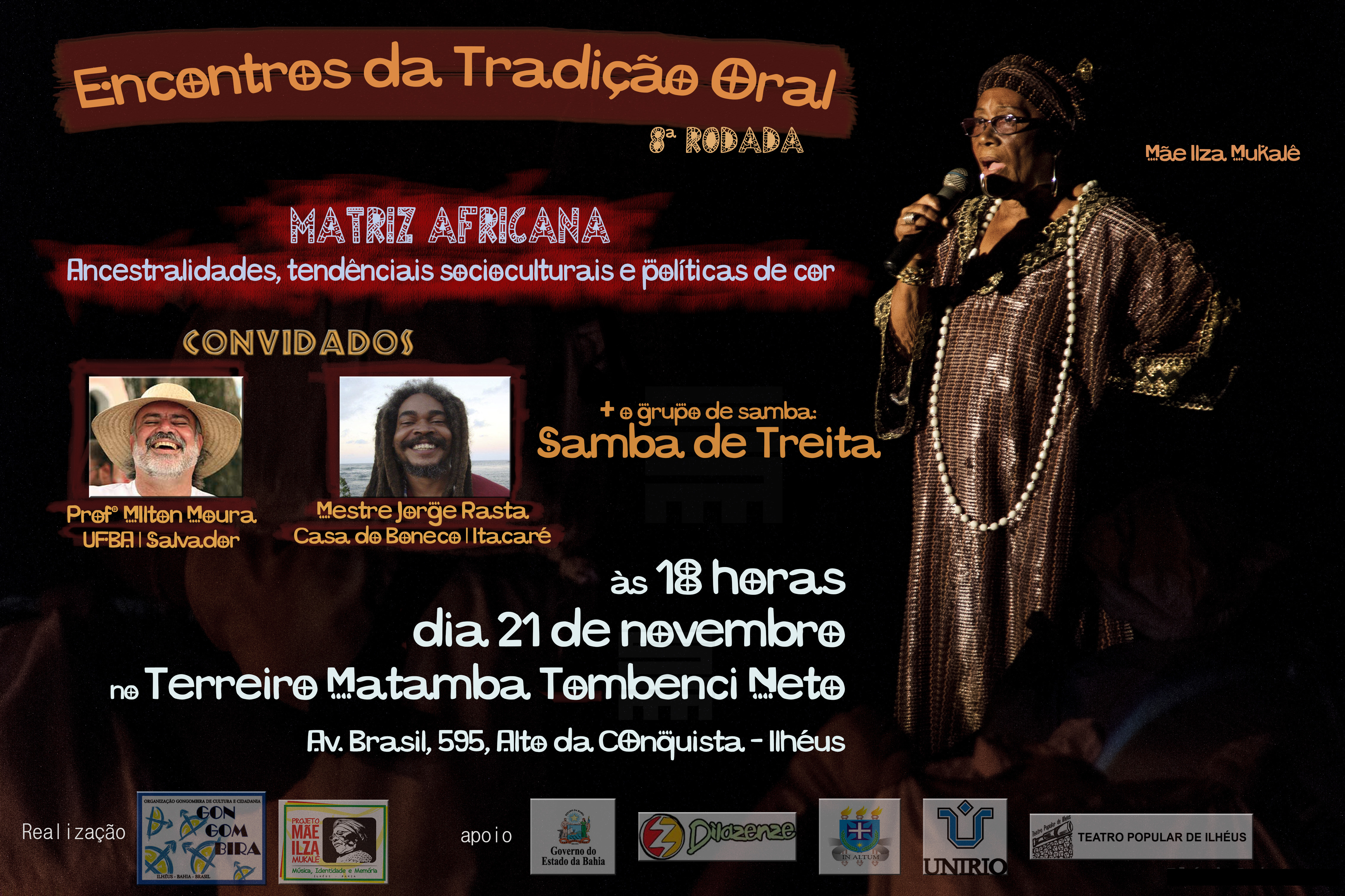 Comemorando o desfecho dos encontros, Mãe Ilza Mukalê, a anfitriã do evento, convida Mestre Jorge Rasta e o Profº Dr. Milton Araújo Moura para falar sobre o tema: “Matriz Africana: Ancestralidades, tendências socioculturais e políticas de cor”. E, para abrilhantar ainda mais a noite de celebração, haverá a participação do grupo ilheense de samba de roda Samba de Treita.