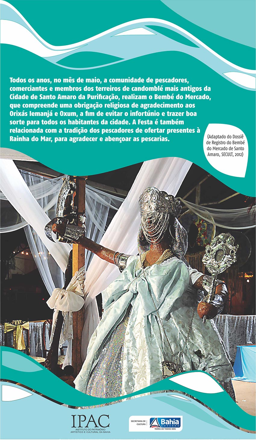 Sobre o livro - ''Bembé do Mercado'' é o sétimo volume da coleção ''Cadernos do IPAC'', que o Instituto vem publicando desde 2009. Os volumes anteriores também são referentes ao patrimônio imaterial ou intangível (bens registrados), sendo eles ''Pano da Costa'', ''Festa da Boa Morte'', ''Carnaval de Maragojipe'' ''Desfile de afoxés'', ''Festa de Santa Bárbara'' e ''Ofício de Vaqueiros''. ''Bembé do Mercado'' trata da manifestação religiosa Bembé do Mercado, Patrimônio Imaterial da Bahia desde 2012. "O Bembé é de extrema importância e significado, pois é estratégico para as populações afrodescendentes, porque ali as pessoas foram conquistando seu espaço e o Bembé é a consolidação desta conquista de espaço", destaca Roberto Pellegrino, gerente de Patrimônio Imaterial do IPAC.