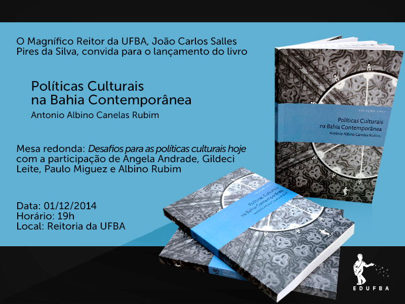 Serviço: O quê: Lançamento do livro Políticas Culturais na Bahia Contemporânea Quando: 01 de dezembro de 2014, segunda-feira, 19h às 21h Onde: Reitoria da UFBA Preço especial de lançamento: R$30,00