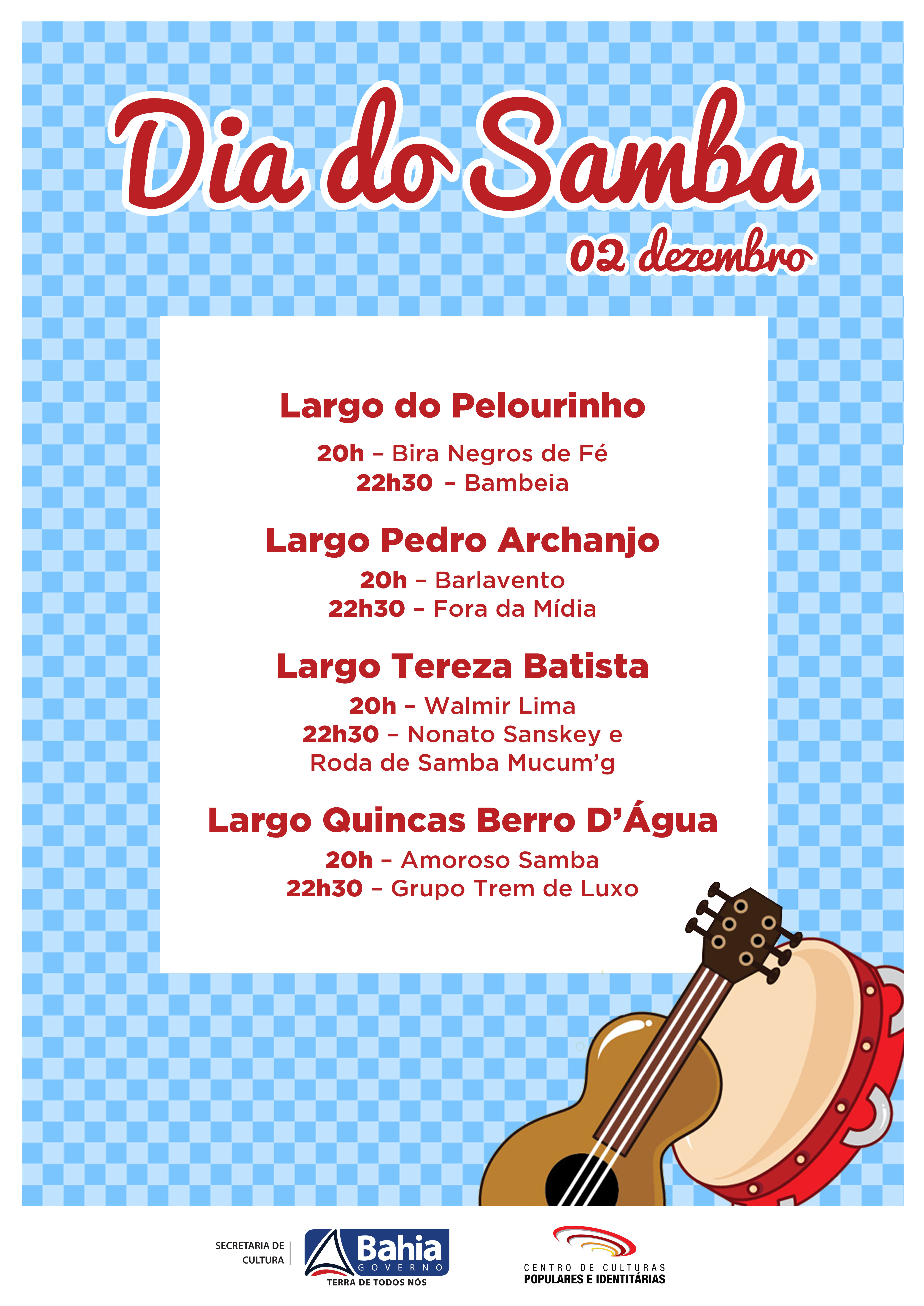 O calendário de festas populares que movimenta a cidade de Salvador no mês de dezembro começa na próxima terça-feira (02), com as comemorações do Dia Nacional do Samba. No Centro Histórico aconteceu a primeira homenagem à data, festejada há mais de 40 anos. A tradição se mantém até hoje, e uma programação gratuita acontece no Largo do Pelourinho e nos largos Pedro Archanjo, Tereza Batista e Quincas Berro D’Água. Durante a noite de 02 de dezembro, oito dos principais sambistas e grupos da Bahia vão reafirmar que não perdem o prazer de cantar samba. A celebração é realizada pela Secretaria de Cultura do Estado da Bahia, através do Centro de Culturas Populares e Identitárias (CCPI).