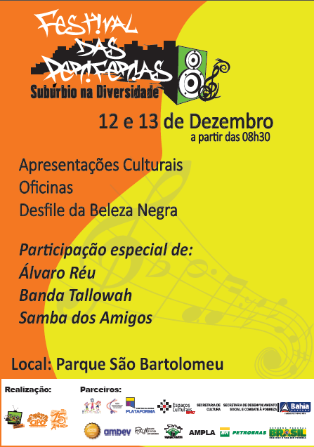 Um encontro produzido com e para jovens do Subúrbio Ferroviário de Salvador. Esse é o objetivo do “Festival das Periferias: Subúrbio na Diversidade” que ocorre entre os dias 12 e 13 de dezembro no Centro de Referência do Parque São Bartolomeu. O evento faz parte das ações do Projeto de Formação em Produção Cultural, realizado pela ONG Cipó Comunicação Interativa e patrocinado pela Petrobras por meio da seleção pública Integração Petrobras Comunidades. O Festival trará um conjunto de oficinas e atrações culturais nas mais diversas linguagens: dança, música, fotografia, grafite, rádio, vídeo, produzidas por grupos culturais juvenis do Subúrbio Ferroviário de Salvador. O primeiro dia ainda contará com o lançamento da campanha “Ei, Pega Visão! Jovem Consciente é Jovem Diferente” que aborda o consumo indevido de bebidas alcoólicas por adolescentes e jovens. Campanha Ei, Pega Visão! Jovem Consciente é Jovem Diferente A campanha produzida pelos jovens em formação na Agência de Comunicação do Subúrbio marca o fim do processo do ciclo anual de mobilizações da turma. A ideia é abordar o problema do consumo de bebidas alcoólicas por adolescentes e jovens a partir de uma linguagem e conteúdos próximos ao cotidiano da juventude da periferia. Compõem a campanha peças de rádio, vídeo, fotografia e Design Gráfico. A Agência de Comunicação do Subúrbio é um projeto da Cipó Comunicação Interativa, financiado pelo Fundo Estadual dos Direitos das Crianças e dos Adolescentes – FéCriança e pelo Programa Jovens de Responsa da AMBEV. Essa ação também conta com o apoio da Associação de Moradores do Núcleo Habitacional Joanes Leste e do Centro Cultural Plataforma. O Projeto de Formação em Produção Cultural e Cultura Digital O Projeto Produção Cultural e Cultura Digital foi contemplado pela seleção pública Integração Petrobras Comunidades, que é voltada para o desenvolvimento de projetos em comunidades do entorno das unidades da companhia. Por meio dela, a Petrobras reforça o compromisso de contribuir para o desenvolvimento sustentável das regiões onde atua, além de promover a democratização do acesso a seus recursos e a transparência na escolha dos projetos selecionados. O objetivo do projeto é contribuir para a qualificação profissional, empreendedorismo e inserção no mercado da economia criativa de jovens do Subúrbio Ferroviário de Salvador. A iniciativa prevê a formação e articulação de coletivos culturais juvenis do Subúrbio Ferroviário de Salvador. Essa ação também conta com apoios estratégicos da Faculdade de Comunicação da UFBA, Sesi Rio Vermelho, Secretaria do Trabalho, Emprego, Renda e Esporte – SETRE, Centro Cultural Plataforma e Associação de Moradores de Plataforma. Serviço: O que? Festival das Periferias: Subúrbio na Diversidade Quando: dias 12 e 13 de dezembro Onde: Centro de Referência do Parque São Bartolomeu Contatos: Geise Oliveira (8181-7431), Leandro Vilas Verde (8187-3769) Programação do Festival 12/12 - Sexta-feira 08:30 - Capoeira 09:10 – Oficinas: formação em mediador de leitura, grafite, poesia. 12:00 - Intervalo 13:30 - Lançamento da Campanha “Ei, Pega Visão! Jovem Consciente é Jovem Diferente” da Agência de Comunicação do Subúrbio. 14:30 - Renascer Dance 15:00 - Grupo Conspiração 15:30 - Ns Crew 16:00 - Street Dance de Alagados 16:30 - Corpo de Baile Raizes Black 13/12 - Sábado 09:30 - Mostra expositiva das oficinas 11:00 - Teatro Raízes de Pirajá 12:00 - Intervalo 14:00 - Batalha Lição Final e Thor 14:30 - Desfile da Beleza Negra 15:20 - Samba dos Amigos 15:40 - Escolha da musa 15:50 - Tallowah 16:20 - Encerramento