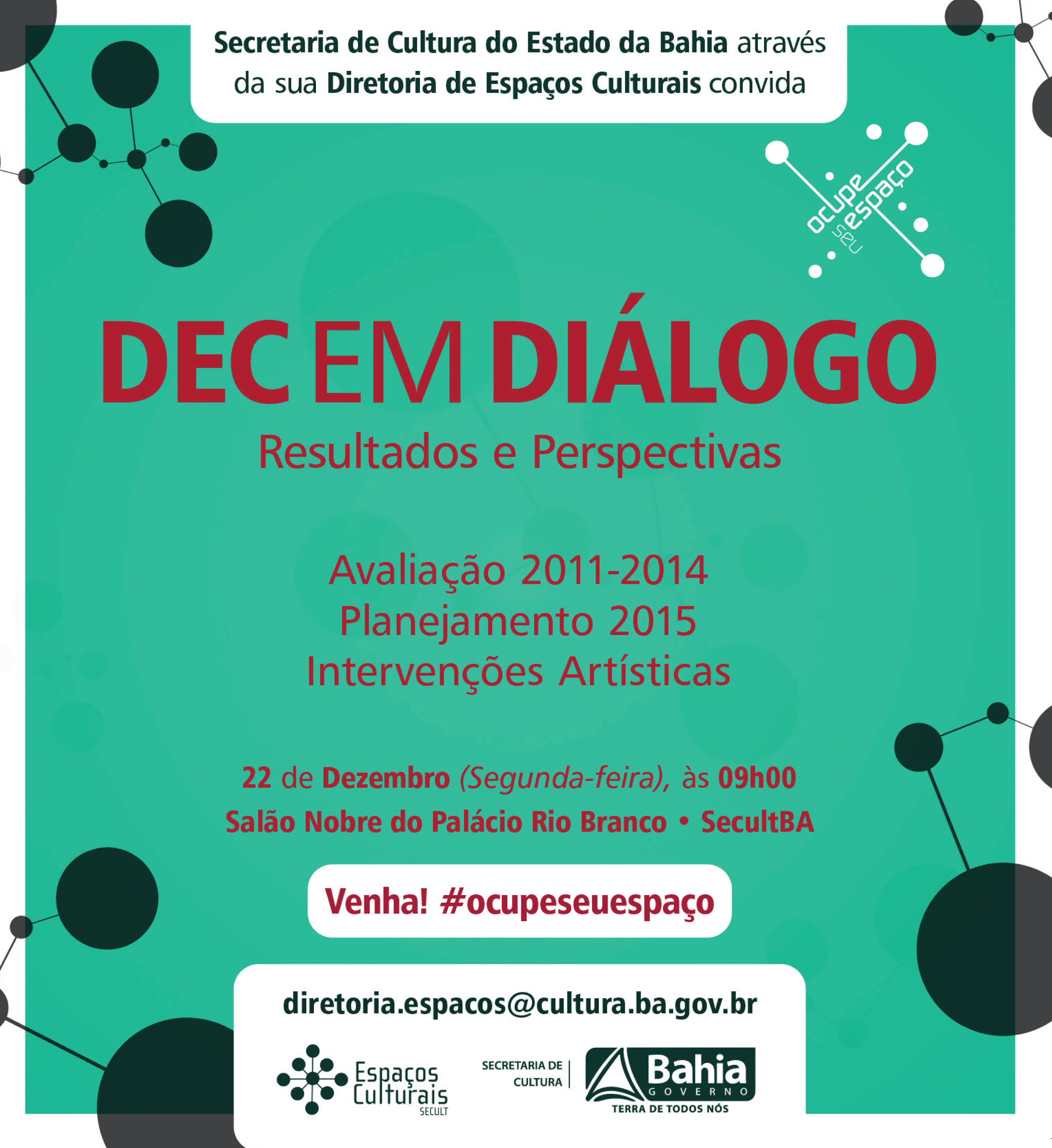 Sendo assim, queremos encerrar 2014 apresentando, avaliando e repensando os resultados que alcançamos. Realizaremos, então, no dia 22/12, Segunda-feira, às 09h, no Salão Nobre do Palácio Rio Branco, mais um DEC em Diálogo, no qual apresentaremos nossos Resultados e traçaremos nossas Perspectivas. Assim, organizamos esse momento para celebrarmos junto aos colaboradores, parceiros e equipe desta Diretoria, aos colaboradores dos Espaços, da Secult e de suas vinculadas, aos artistas e produtores, aos fornecedores, aqueles que fazem parte da família DEC.