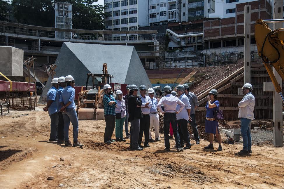 Uma Concha Acústica mais segura, acessível e confortável. É desta forma que a Secretaria de Cultura do Estado da Bahia (Secult-BA) pretende entregar o espaço cultural ainda no primeiro semestre de 2015. O secretário estadual de Cultura, Albino Rubim, acompanhado do Chefe de Gabinete da pasta, Rômulo Cravo, do diretor geral do TCA, Moacyr Gramacho, e da diretora artística do complexo, Rose Lima, visitou na manhã desta segunda-feira (22 de dezembro) as obras do projeto NOVO TCA, que nesta 1ª etapa contemplará a requalificação da Concha Acústica, a construção de um deck park com 300 vagas de estacionamento e as bases da nova Sala Sinfônica. “A Concha terá um ganho técnico, pois vai oferecer mais possibilidades cênicas e se tornará um espaço ainda mais versátil. Para o público, o ganho será em conforto e segurança, com o aumento do número de catracas, da área de circulação, novos banheiros, camarotes mais espaçosos, enfim, um espaço modernizado e que funcionará dentro de todas as normas de segurança e acessibilidade”, declarou Moacyr. Os investimentos realizados nesta 1ª fase, que teve suas obras iniciadas em dezembro de 2013, somam o valor total na casa dos R$ 66 milhões. Na visita, realizada nesta manhã, a equipe foi recebida por André Sampaio, um dos sócios da AXXO Construtora – empresa responsável pelas obras do projeto NOVO TCA – e também por Carlos Maurício Alves, Gerente de Obras da empresa. “Aqui a gente entende realmente a grandeza e a dimensão do que vai ser o Novo Teatro Castro Alves que, sem dúvida, se tornará um dos centros culturais mais importantes da América Latina. É impressionante constatar a quantidade de terra que teve que ser retirada, o volume de escavações, as estruturas que estão sendo erguidas, enfim, é um desafio de engenharia gigantesco, mas que está sendo enfrentado de forma muito séria e competente por todos os envolvidos”, afirmou Albino. “O governo do estado tem um grande projeto nas mãos que é o de requalificar e de ampliar este grande e importante complexo cultural. E eu tenho certeza que este grande sonho, que é de todos, não acaba com o fim desta 1ª etapa”, atestou o diretor do Teatro Castro Alves. O desafio previsto na 2ª etapa do projeto NOVO TCA contempla a criação de uma Sala de Cinema, a reforma de toda a área administrativa e da Sala Principal, a construção da Sala Sinfônica com 600 lugares, que oferecerá aos músicos e ao público qualidade acústica de padrão internacional, além da transformação do Centro Técnico num Centro de Referência em Engenharia do Espetáculo (CREE).