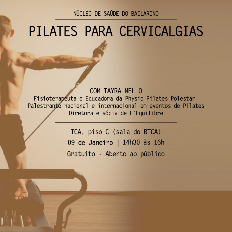 O Balé Teatro Castro Alves (BTCA) continua promovendo Aulas Abertas gratuitas, ministradas por bailarinos da própria companhia, neste mês de janeiro, podendo participar profissionais ou alunos de dança em nível avançado. A novidade é que na próxima sexta-feira (09 de janeiro), o BTCA promove duas atividades integradas, começando com uma aula aberta de Pilates, com a bailarina Alice Becker, das 13h15 às 14h15, seguida do workshop "Pilates para Cervicalgias", ministrado pela profissional Tayra Mello, às 14h30, na Sala de Ensaio do BTCA, no piso C do TCA. A atividade integra o projeto “Núcleo de Saúde do Bailarino” e as inscrições são gratuitas. A companhia baiana de dança contemporânea é mantida pela Secretaria de Cultura do Estado da Bahia (Secult-BA), através da Fundação Cultural do Estado da Bahia (Funceb) e do TCA. A atividade, de natureza prático-teórica, apresentará aos presentes uma série de exercícios e conceitos de como posicionar melhor sua cervical durante os movimentos em suas aulas e nas atividades de vida diária. O workshop gratuito será conduzido pela profissional Tayra Mello, fisioterapeuta formada pela UCSAL, com especialização em fisioterapia em traumato-ortopedia e terapia manual, formação em RPG básico e avançado em patologias cervicais. Tayra atua como educadora da Physio Pilates Polestar e é palestrante nacional e internacional em eventos de Pilates, além de ser diretora e sócia da L''Equilibre. SERVIÇO: NÚCLEO DE SAÚDE DO BAILARINO - BTCA Aula Aberta de Pilates – Com Alice Becker Workshop “Pilates Para Cervicalgias” – Com Tayra Mello Local: Sala de Ensaio do BTCA - Piso C do Teatro Castro Alves. Quando: 09 de janeiro (sexta-feira) Horário: das 13h15 às 14h15 (aula aberta) e das 14h30 às 16h (workshop) Inscrições gratuitas: (71) 3117-4846 ou comunicacaobtca@gmail.com