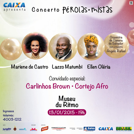 Para celebrar e valorizar a cultura afro-brasileira, o Museu du Ritmo recebe, na próxima terça-feira, dia 13 de janeiro, a segunda temporada do Concerto Pérolas Mistas, a partir das 19h. Este é mais um projeto idealizado por Carlinhos Brown que, com direção de Elísio Lopes Jr., promove um espetáculo cênico musical de contemplação à música de matriz africana. Ellen Oléria, Mariene de Castro, Lazzo e Carlinhos Brown formam o grupo de solistas que, nesta primeira edição desta temporada, vai apresentar um repertório rico em canções dos blocos afros e clássicos da música negra do mundo, junto a Orquestra de Câmara de Salvador, regida pelo maestro Ângelo Rafael Fonseca, e aos alabês convidados. “O espetáculo prima pela nobreza da nossa cultura negra. Sermos todos pérolas é o mote para a concepção cênica luxuosa que estamos buscando. E a poesia não só da música mas também do visual e dos textos que são interpretados pelos solistas”, explica o diretor Elisio Lopes. O Pérolas Mistas tem o concerto musical como elemento central, mas seu grande diferencial está em trazer toda a musicalidade presente nos terreiros, fortalecendo e demonstrando a relevância da música ancestral da Bahia, com uma produção teatral presente, por exemplo, na cenografia, concebida por Renata Motta e nos figurinos, do estilista Ismael Souddam. O espetáculo, que continua com os mesmos anfitriões e novos blocos afros nos dias 20, 27 e 03 de fevereiro, é realizado pela Candyall Entertainment e conta com os patrocínios de Secretaria da Fazenda, Secretaria da Cultura e Governo do Estado da Bahia, através do FazCultura, Schin e Caixa, além dos apoios de SeAgitte, Uranus2 e restaurante 33 Downtown. Os ingressos estão à venda por R$ 40 nos balcões da Ticketmix e através do site Ingresso Rápido. Pérolas Mistas Atrações: Ellen Oléria, Mariene de Castro, Lazzo Matumbi, Carlinhos Brown, Orquestra de Câmara de Salvador, com o maestro Ângelo Rafael Fonseca e o Cortejo Afro. Local: Museu Du Ritmo, Comércio - Salvador (BA) Data: 13 de janeiro Horário: a partir das 19 horas Ingresso: R$ 40 Vendas nos balcões da Ticketmix e através do site Ingresso Rápido Informações: Candyall Entertainment (71) 3113-1504