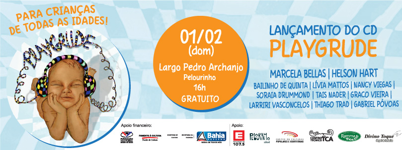 Em outubro do ano passado Marcela Bellas e Helson Hart lançaram o Playgrude, disco infantil com nove músicas inéditas, interpretadas por diferentes artistas da nova cena musical baiana. O disco virou show, um show para crianças de todas as idades!