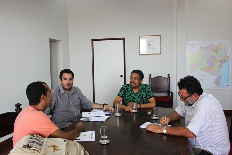 Os representantes da Associação dos Dirigentes Municipais de Cultura da Bahia (Adimcba) Adelson Fonseca, da cidade de Rio Real, e Emílio Tapioca, de Andaraí, compareceram na tarde desta quinta-feira, 29 de janeiro, em reunião na Secretaria de Cultura do Estado (SecultBA). Junto a eles, estiveram o titular da pasta, Jorge Portugal, e o Superintendente do Desenvolvimento Territorial da Cultura, Sandro Magalhães. Além de se apresentarem no intuito de abrir um canal direto de diálogo com o Secretário, os dirigentes levaram uma pauta de questões a serem debatidas e resolvidas conjuntamente com a SecultBA. A principal delas refere-se à cooperação financeira, posta no convênio de número 001/2011, firmado entre as partes como forma de apoio do estado às atividades da Associação, como previsto em lei. Outra demanda de destaque é assegurar a continuidade das políticas de territorialização da cultura no estado.