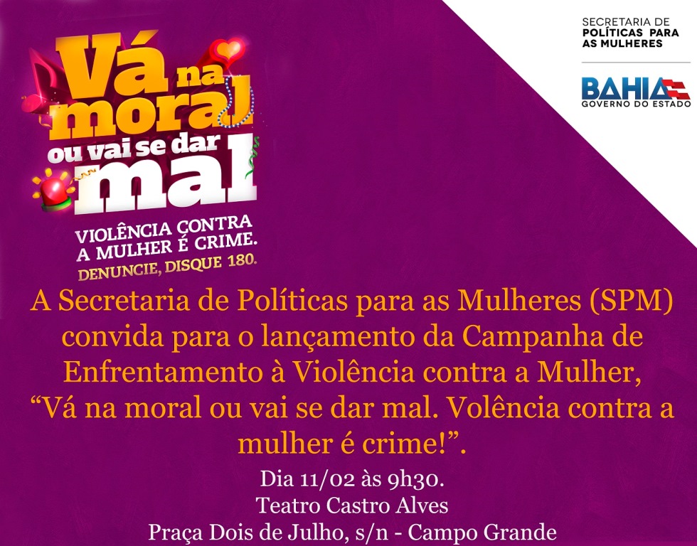 A Secretaria Estadual de Políticas para as Mulheres (SPM) apresenta na próxima quarta-feira (11), a partir das 9h30, a Campanha de Enfrentamento à Violência contra a Mulher no Carnaval da Bahia. A coletiva de imprensa será realizada no foyer do Teatro Castro Alves e contará com a presença de artistas, da Secretária da SPM, Olívia Santana, dentre outras autoridades.