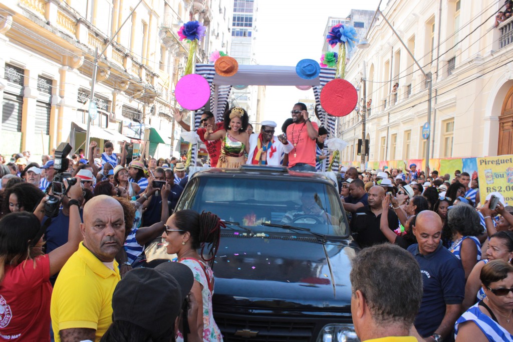 Faltavam cinco minutos para as 15 horas e um grande alvoroço se forma na entrada lateral do Palácio Rio Branco. Os transeuntes talvez tenham ignorado o fato porque a esta altura a bandinha de sopro e percussão já soava mais alto que as buzinas e descargas dos carros na rua. Xande de Pilares, cantor sambista e personalidade televisiva, chegava para ser coroado Rei da 25ª Lavagem Cultural – a festa pré-carnavalesca promovida todos os anos pelos funcionários da Fundação Cultural do Estado da Bahia, sempre na quarta-feira que antecede o Carnaval. “Pela idolatria que tenho pela Bahia, por sua cultura, pelo seu povo, eu me sinto prestigiado de estar nesse lugar”, celebra Xande. Emocionante foi a chegada do homenageado da Lavagem, Riachão, do alto de seus 93 anos, sorrindo e cantando. Até que o trio se completa, na chegada da Rainha Juliana Ribeiro, vestido estampado, coroa na cabeça. “Eu estou dizendo a todos que o meu reinado vai ser o reinado das crianças, que a gente lembre que elas precisam de lugar no carnaval. É por elas que eu estou aqui, para que a gente lembre que tem essa responsabilidade e de que é através delas que o carnaval se renova”, conclamou a rainha, ao lado dos outros dois ídolos. A honraria foi recebida das mãos do Secretário de Cultura, Jorge Portugal, ao lado da Presidente da Fundação Cultural, Fernanda Tourinho.