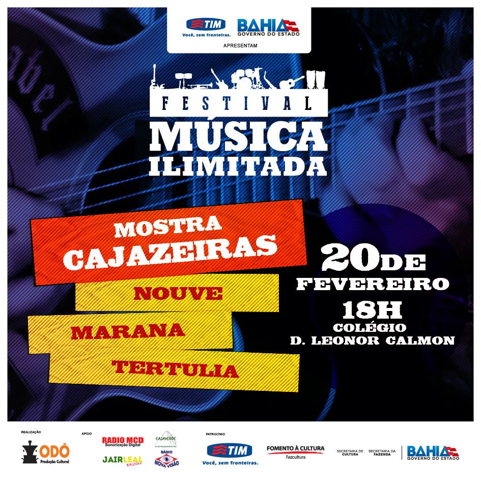 Depois de ter passado pelo Engenho Velho de Brotas, o Festival da Música Ilimitada agora conhecerá as atrações musicais do maior bairro da América Latina, Cajazeiras. No local, o júri artístico e técnico, vai escolher quem será o representante para as finais do projeto que acontecem em abril. As bandas Tertúlia, Nouve e Marana se apresentam no Colégio D. Leonor Calmon, nesta sexta-feira, dia 20 de fevereiro, a partir das 18 horas.