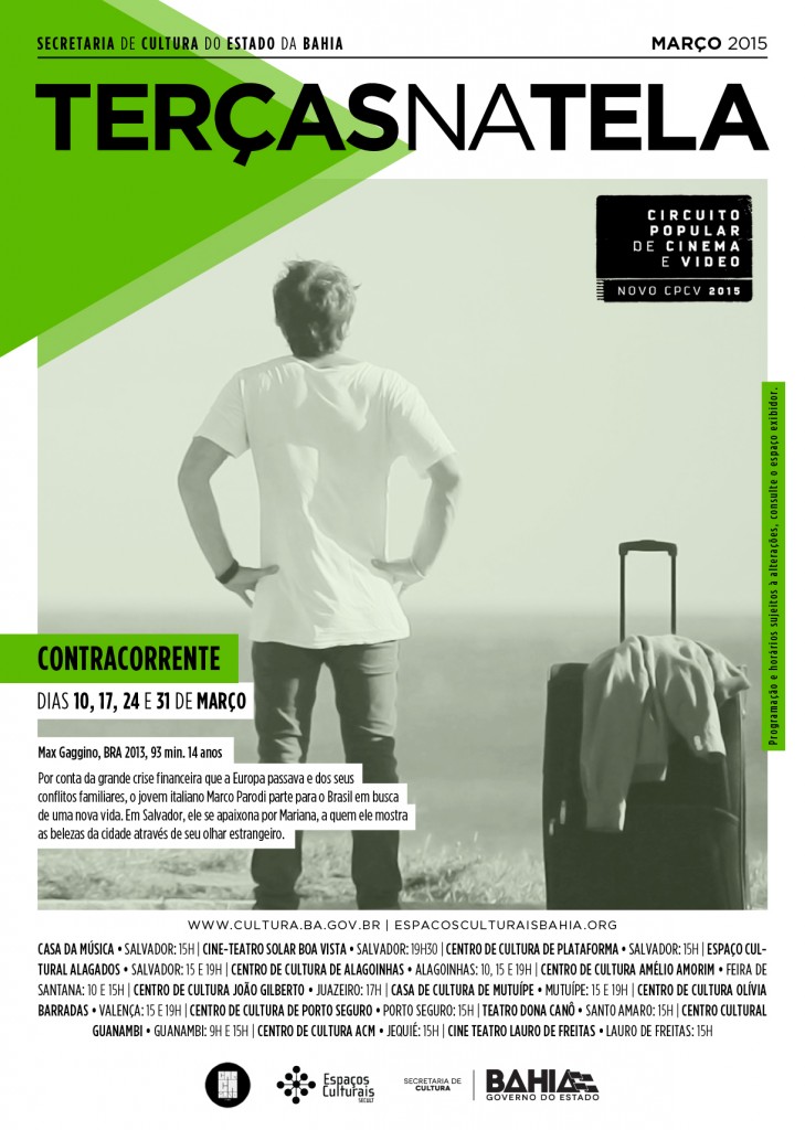 Os amantes do cinema na Bahia têm muito que comemorar: o Circuito Popular de Cinema de Vídeo, projeto realizado pela Secretaria de Cultura do Estado da Bahia (SecultBA) e Fundação Cultural do Estado da Bahia (FUNCEB), através das diretorias de Espaços Culturais (DEC) e de Audiovisual (DIMAS), está de volta com o melhor do Cinema Nacional nos 17 Espaços Culturais SecultBA distribuídos pelo estado. Contracorrente Para iniciar as atividades em 2015, nas terças-feiras de março, o CPCV traz a comédia dramática de Max Gaggino sucesso de público em 2014, Contracorrente. A história se passa entre as cidades de Gênova e Salvador na Bahia. O ano é 2013, a Europa vive uma terrível crise financeira. O protagonista, Marco Parodi, vivido pelo ator Francesco Morotti, é um jovem italiano de classe baixa que mora com os pais e a irmã em um pequeno apartamento no centro histórico de Gênova. A tensão dentro de casa aumenta quando a avó passa a morar com a família, por não conseguir pagar o aluguel. Sufocado por todo esse momento e com as contínuas brigas em casa, Marco toma a atitude de sair do próprio país e viaja rumo à Salvador, no Brasil. É na capital baiana que conhece Neca (Leandro Rocha) e Mariana (Laíse Leal). O orçamento de Contracorrente foi de apenas R$ 20 mil, sendo que 70% dele foi gasto com passagens da equipe para a cidade de Gênova. A trilha sonora do filme é formada por canções de músicos e bandas independentes da Bahia, como Dão e Scambo. Caravana CPCV Para marcar o início desta nova temporada, o projeto Caravana CPCV circulará com o diretor Max Gaggino e o ator Leandro Rocha. No dia 10 de março, os dois irão bater um papo com o público do Centro Cultural Plataforma, às 15h, e no Espaço Cultural Alagados, às 19h. Já no dia 17 de março, será a vez do público do Cine Teatro Lauro de Freitas, às 15h, e da Casa da Música, às 19h. Na ocasião, o diretor e o ator irão, além de compartilhar impressões sobre o filme, abordarão a sua temática e os desafios de sua produção. A entrada é gratuita. O CPCV Em 2014, 5.471 pessoas fizeram dos Espaços Culturais da Secult sala de cinema nas mostras temáticas mensais que contemplaram temas como diversidade, futebol, cultura negra, política, cinema infantil, literatura e culturas populares, além de diversas parcerias com a Bienal da Bahia, evento que mobilizou a cena cultural no Estado em várias modalidades artísticas. Como novidade, o CPCV promove até novembro, em todas as terças-feiras, exceto feriados, a exibição de um único filme por mês e não mais um por semana como no ano passado. A medida foi tomada com o intuito de dar oportunidade para o espectador conhecer melhor a obra que está em cartaz. O Circuito Popular de Cinema e Vídeo é uma iniciativa que promove a prática cineclubista nos espaços culturais da SecultBA. Todos os meses, o CPCV traz filmes atuais e clássicos do cinema, em diversos estilos, sempre pensados dentro de uma temática. Ao longo de todo o ano, uma programação intensa ocupa os espaços, toda semana, dentro do projeto Terças na Tela, no qual, em todas às terças-feiras, acontece exibições em três horários diferentes, às 10h, 15h e 19h. Consulte o espaço cultural mais próximo de sua casa. Serviço Circuito Popular de Cinema e Vídeo – CPCV Mostra Novo CPCV 2015 Dias 10, 17, 24 e 31 de Março Sessões às 10h, 15h e 19h* Entrada Gratuita