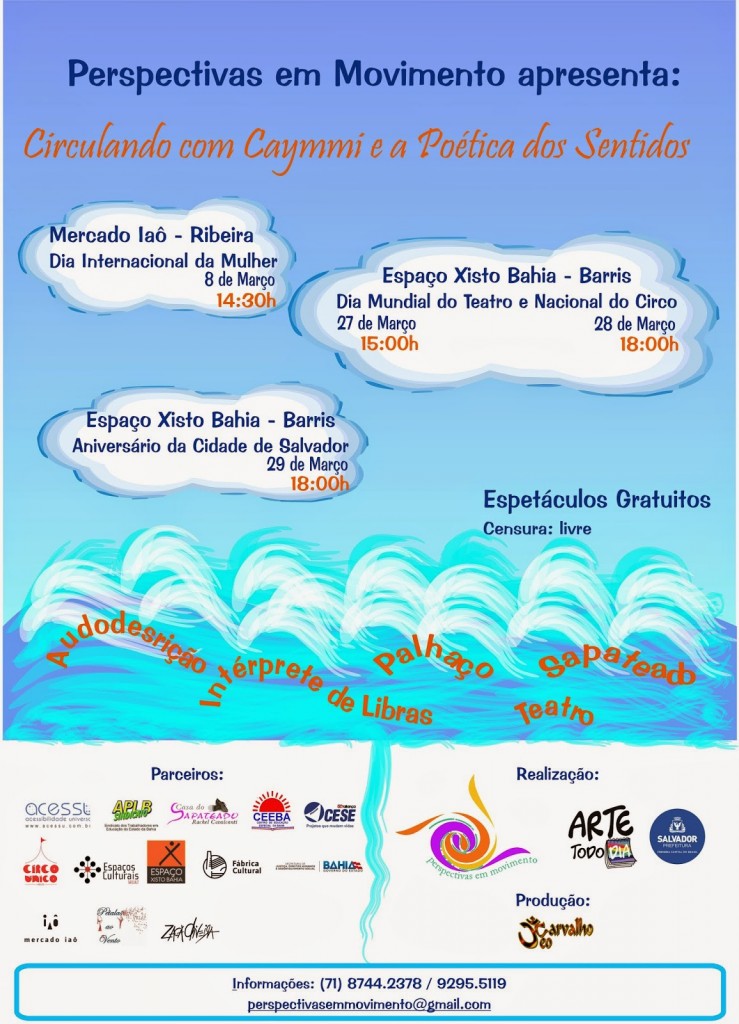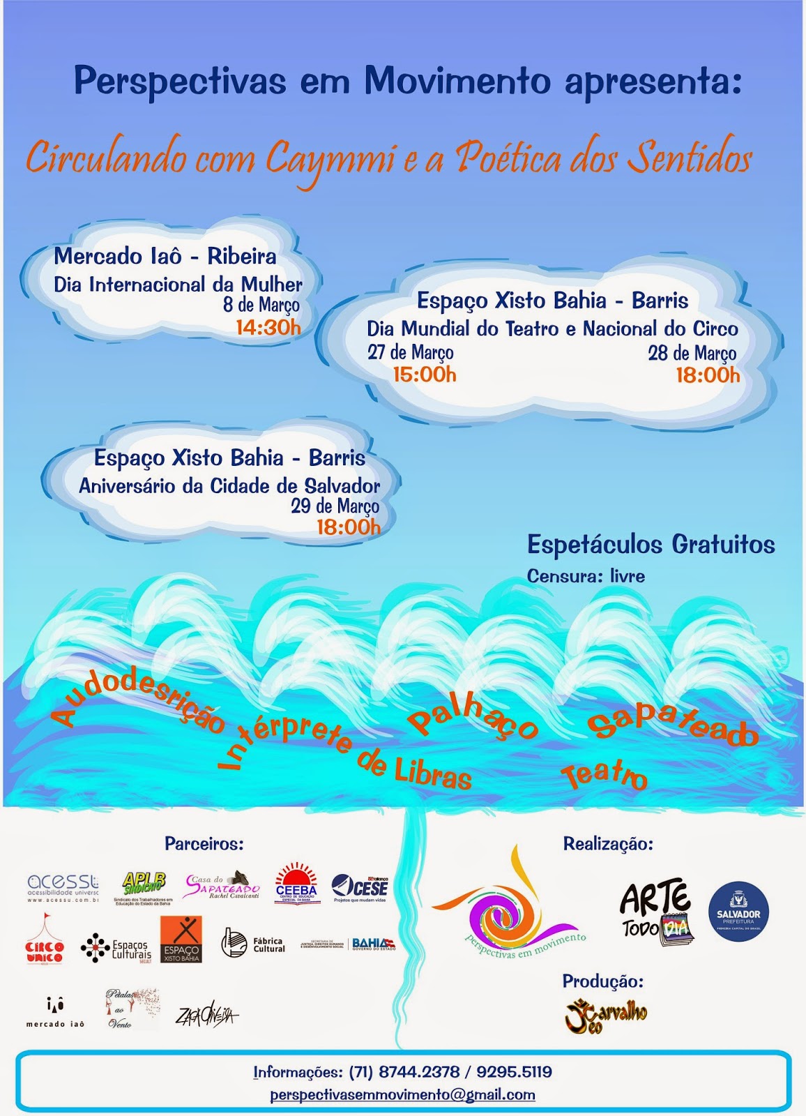 Para celebrar a milenar expressão da arte teatral, o Espaço Xisto Bahia, no bairro dos Barris, recebe o espetáculo “Circulando com Caymmi e a Poética dos Sentidos: Perspectivas em Movimento”. As apresentações ocorrem entre os dias 27 e 29 de março, sempre às 18h. A peça, que conta com recursos de acessibilidade comunicacional (audiodescrição e intérprete de libras), permeia as três vertentes de criação de Dorival Caymmi: canções praieiras, samba-canção e os sambas baianos. No repertório, o público poderá apreciar a sabedoria das composições do artista ícone da Bahia, dentre elas os sucessos “O que é que a baiana tem” “Maracangalha”, “O mar” “A Vizinha do Lado” dentre muitas outras que têm como característica marcante a inigualável maneira de narrar a história do povo baiano, transitando pelas paixões pelo mar, o universo feminino e a religiosidade. O projeto é uma ação de promoção cultural a públicos que comumente tem pouco contato com o tipo de trabalho desenvolvido pela companhia e com as obras de Dorival Caymmi. O foco é possibilitar equidade no consumo cultural às pessoas com deficiência. Escolhido pelo Espaço Xisto Bahia, “Caymmi e a Poética dos Sentidos” será a grande atração para a celebração do Dia Mundial do Teatro e Nacional do Circo (27/03) e, no dia 29/03, o grupo comemora os 466 anos da cidade de Salvador. Todas as sessões são abertas ao público de todas as idades e conta com acessibilidade plena, contemplando a diversidade de público. Espaços Culturais da SecultBA A Secretaria de Cultura do Estado mantém 17 Centros Culturais espalhados pelo interior geridos pela Diretoria de Espaços Culturais (DEC). Destes, 5 encontram-se na capital e 12 em diferentes territórios de identidade da Bahia, nos municípios de Lauro de Freitas, Feira de Santana, Valença, Juazeiro, Alagoinhas, Santo Amaro, Guanambi, Porto Seguro, Itabuna, Vitória da Conquista, Jequié e Mutuípe. Em Salvador, eles são: Cine Teatro Solar Boa Vista, Espaço Xisto Bahia, Casa da Música de Itapuã, Centro de Cultura de Plataforma e Espaço Cultural Alagados. SERVIÇO Circulando com Caymmi e a Poética dos Sentidos 27, 28 e 29 de março, às 18 h Classificação livre com entrada gratuita Espaço Xisto Bahia (Rua General Labatut, 27, subsolo do prédio da Biblioteca Pública, Barris)