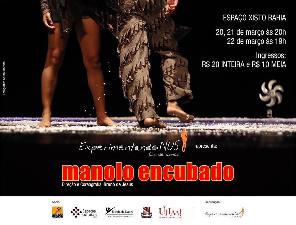 O espetáculo de dança “Manolo Encubado” terá temporada de três dias no Espaço Xisto Bahia. A obra da ExperimentandoNUS Cia. de Dança será apresentada nos dias 20 e 21/03 às 20h e 22/03 às 19h. O ingresso custa R$ 20 (inteira) e R$ 10 (meia). A montagem conta com apoio da Fundação Cultural do Estado da Bahia, por meio do Centro de Formação e Artes - Escola de Dança da Funceb.