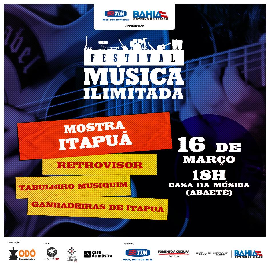 A Tabuleiro Musiquim tem dois anos em atividade, um EP lançado em 2012 e um disco batizado de “imbigo” lançado em 2014. O grupo faz um som que funde o rock a gêneros mais regionais como o ijexá, o fricote e ritmos latinos. A influência é por artistas que marcaram o final da década de setenta como Caetano Veloso, Gilberto Gil, Novos Baianos e também de outros que participaram da fase conhecida na Bahia como pré axé music como Luiz Caldas e Armandinho. A atração é formada por Silvio de Carvalho (Voz e Guitarra), Victor Jesus (Guitarra), Henrique Duarte (Baixo) e Allan Villas Boas (Bateria). Formada em 2010, a banda Retro Visor explora a linguagem universal da música instrumental, colocando em evidência o vibrafone como o comunicador e principal responsável pelas harmonias, melodias e improvisos. A junção entre a bateria, a percussão e o baixo forma no ouvinte a sensação de um único bloco sonoro. As apresentações do Retro Visor sempre contam com suporte da linguagem audiovisual, com projeções de fotos e vídeos. O repertório do grupo é basicamente autoral e as músicas dialogam com o rock, bossa nova, música afro-brasileira, funk e sinfônica. No EP lançado em 2012, o Retro Visor reuniu quatro faixas autorais e uma bônus track, versão para “”Chega de Saudade”", de Vinícius de Moraes e Antônio Carlos Jobim. Música Ilimitada - No projeto, dez localidades de camadas populares, sendo oito em Salvador e uma em Lauro de Freitas e outra em Camaçari, funcionam como polos musicais, nos quais três bandas se apresentam e uma se classifica para ficar entre as dez, que disputam as seis vagas para a grande final. Das mostras serão classificadas dez bandas que serão submetidas à votação popular, através da internet, que escolherá um representante. Outras cinco serão indicadas por um júri formado por renomados profissionais da música baiana. Entre os critérios de seleção, os jurados avaliarão interpretação, qualificação técnica do grupo, mérito artístico, autoralidade, originalidade e performance de palco.Nas finais as seis bandas selecionadas se apresentarão, no mesmo palco com atrações de destaque da música brasileira. Os três primeiros colocados do festival serão contemplados com diversos prêmios para melhor gerenciamento de carreira. Festival da Música Ilimitada – Itapuã Dia 16, às 18 horas Local Casa da Música – Itapuã Atrações: Ganhadeiras de Itapuã, Tabuleiro Musiquim e Retro Visor