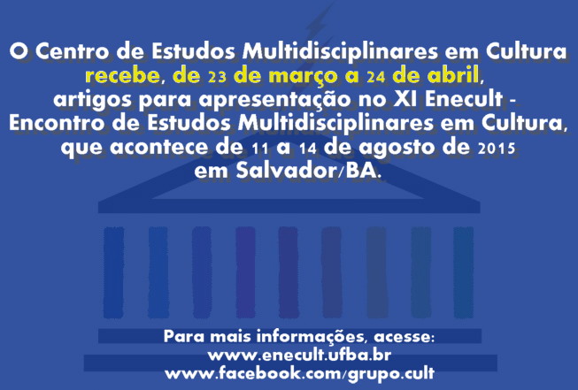 O Centro de Estudos Multidisciplinares em Cultura – CULT da Universidade Federal da Bahia – UFBA, recebe artigos para apresentação no XI Encontro de Estudos Multidisciplinares em Cultura – Enecult. Seguindo sua importante trajetória de promoção do diálogo sobre cultura entre diferentes áreas do conhecimento, a décima primeira edição do Encontro agrega minicursos, simpósios, relatos de experiência, encontros de redes e apresentação de trabalhos. O Enecult é reconhecido como o maior evento de estudos em cultura do país.