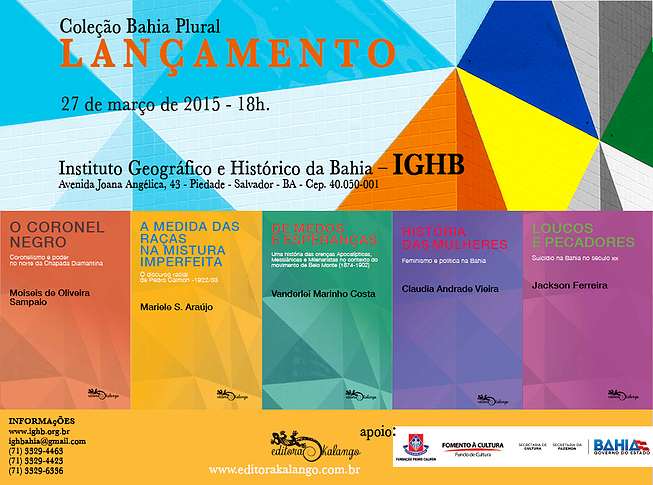 Após o seminário, das 18h às 22h, será lançada a Coleção Bahia Plural, pela Editora Kalango. Trata-se do conjunto de cinco livros, frutos das teses de dissertações de cinco professores baianos, que tratam de períodos e temas diversos da História da Bahia, com valor científico e cultural.  Os autores estarão presentes autografando os exemplares, que serão disponibilizados em box promocional pelo custo de R$ 40,00 (quarenta reais). Formam o conjunto os livros: “O Coronel Negro: Coronelismo e poder no Norte da Chapada Diamantina” (Moisés O. Sampaio), “A medida das raças na mistura imperfeita. O discurso racial de Pedro Calmon (1922/1933)” (Mariele S. Araújo), “De medos e esperanças. Uma história das crenças apocalípticas, messiânicas e milenaristas no contexto do movimento de Belo Monte (1874-1902)” (Vanderlei M. Costa), “Loucos e Pecadores: suicídio na Bahia no século XIX” (Jackson Ferreira) e “História das mulheres, feminismo e política na Bahia” (Claudia Andrade Vieira). A Editora Kalango é referência em publicações de autores baianos e esta coleção é fruto do Edital 26/2012 de Apoio a Publicação de Livros por Editoras Baianas. SERVIÇO Seminário e Lançamento Literário: Coleção Bahia Plural Data: 27 de Março Hora: 14h às 22h Local: Instituto Geográfico e Histórico da Bahia Avenida Joana Angélica, 43 - Piedade