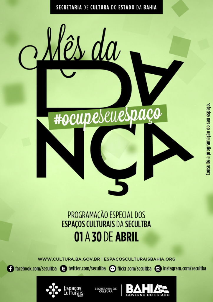 Em comemoração ao Dia Internacional da Dança - 29 de abril - a milenar arte de usar os movimentos do corpo para manifestar e provocar sentimentos terá um mês inteiro de celebração nos Espaços Culturais SecultBA. São atividades especiais em sete territórios de identidade espalhados pelo estado, que contemplam mostras e apresentações de diversos grupos, além de oficinas de gêneros variados, dando continuidade à campanha #OcupeSeuEspaço, da DEC. As ações serão gratuitas ou a preços populares. No cine Teatro Solar Boa Vista, localizado no Bairro do Engenho Velho de Brotas, acontece a estreia do projeto ''Solar Boadança'' no dia 22,uma parceria entre a Diretoria de Espaços Culturais (DEC) e o Balé Teatro Castro Alves (BTCA), que visa propor formação continuada aos participantes. As aulas serão ministradas pelo bailarino Sylvan Barbosa. O Espaço Xisto Bahia, no bairro dos Barris, recebe atividades do “9º Festival VivaDança” nos dias 11, 12 e 14. Os ingressos custam R$ 20 (inteira) e R$ 10 (meia). Confira a programação no site do Festival Viva Dança e no blog do Espaço Xisto Bahia. Nos dias 18, 19, 25 e 26 o Centro Cultural de Plataforma promove o espetáculo “Abrupto e Convidados”, do grupo “Companhia de Dança Reforma”, residente da casa. O intuito é proporcionar a troca de experiências entre grupos de diversos cantos da cidade, promovendo a integração dos movimentos de dança da capital baiana e outras regiões. Os ingressos custam R$10 e R$ 5(meia). O Centro Cultural de Alagados, localizado no bairro do Uruguai, em Salvador, recebe o grupo de dança “Vem chamegar comigo”, no dia 09, às 17h. Já dia 10, no mesmo horário, é a vez do “Grupo Renascer Dance”, e no dia 11, às 19h o grupo local “Conspiração” se apresenta no local. Todas as atividades custam R$ 2,00. Em Feira de Santana, no Centro de Cultura Amélio Amorim, o Balé Popular de Recife, através da Mostra Sesc 2015, oferece as oficinas de dança do Palco Giratório, no dia 15. São vinte vagas para atividades gratuitas. Já no dia 16, às 19h, a companhia apresenta o espetáculo “Palco Giratório”, com entrada franca. Em Valença, o Centro de Cultura Olívia Barradas promove oficinas gratuitas de Dança Afro, “B Boy”, “Hip Hop”, Dança Contemporânea, Balé Clássico e Dança do Ventre, dentre outras linguagens durante todo o mês. As inscrições já estão abertas e são realizadas por ordem de chegada através de preenchimento de formulário no espaço. Quer mais? Acontecem ainda os concursos “Se ela Dança eu Danço”, nos dias 4 e 5, às 19h, e “Baladas Dance 2015”, nos dias 17,18 e 19, às 19h, que movimentam o território de identidade do Baixo Sul. Também tem oficina de dança no João Gilberto, em Juazeiro. Entre os dias 06 e 10, o "Coletivo de Dança de Juazeiro" oferece oficinas gratuitas de Dança Contemporânea. As inscrições são gratuitas e realizadas no Centro de Cultura. No dia 23, às 19h tem a "6ª Mostra Juazeirense de Dança", com grupos profissionais e amadores. A classificação é livre e a entrada franca. Já no dia 25, às 19h, o grupo “Cia de Talentos promove o espetáculo “Mímicos”, que revela a magia da técnica circence “clown”. A entrada custa 10 reais. As oficinas não param por aí. O Centro Cultura de Alagoinhas e o Grupo Mescla promovem, nos dias 25 e 26 de abril, a “Oficina de Preparação Corporal e Dança”. As inscrições são gratuitas e realizadas no local. No dia 29, às 9h tem o “Workshop de Dança”, promovido pela Escola de Dança Ana Fabíola, com entradas a R$ 10. Espaços Culturais da SecultBA - A Secretaria de Cultura do Estado da Bahia mantém 17 espaços culturais geridos pela Diretoria de Espaços Culturais (DEC), e localizados em diversos Territórios de Identidade. Destes, cinco encontram-se em Salvador - Cine Teatro Solar Boa Vista, Espaço Xisto Bahia, Casa da Música de Itapuã, Centro de Cultura de Plataforma e Espaço Cultural Alagados - e 12 nos municípios de Lauro de Freitas, Feira de Santana, Valença, Juazeiro, Alagoinhas, Santo Amaro, Guanambi, Porto Seguro, Itabuna, Vitória da Conquista, Jequié e Mutuípe. #OcupeSeuEspaço – A campanha #OcupeSeuEspaço” chama atenção para uma vasta e diversa programação nos espaços culturais durante o mês de abril. O mote da campanha é inspirado no Programa de Dinamização de Espaços Culturais – Ocupe Seu Espaço, um conjunto de ações e projetos encabeçados pela Diretoria de Espaços Culturais (DEC) / SecultBA, a fim de promover o uso democrático dos Centros de Cultura / Espaços Culturais, tanto do ponto de vista do público, como da ocupação da pauta. Territórios de identidade - Com o objetivo de identificar prioridades temáticas definidas a partir da realidade local, possibilitando o desenvolvimento equilibrado e sustentável entre as regiões, o Governo da Bahia passou a reconhecer a existência de 27 Territórios de Identidade, constituídos a partir da especificidade de cada região. Sua metodologia foi desenvolvida com base no sentimento de pertencimento, onde as comunidades, através de suas representações, foram convidadas a opinar. >> Cine-Teatro Solar Boa Vista celebra o mês da Dança com intensa programação >> Centro Cultural de Guanambi promove oficina de dança para estudantes da rede pública >> Programação completa - Mês da dança- Espaços Culturais Serviço Mês da Dança- Programação nos Espaços Culturais SecultBA Durante todo mês de Abril
