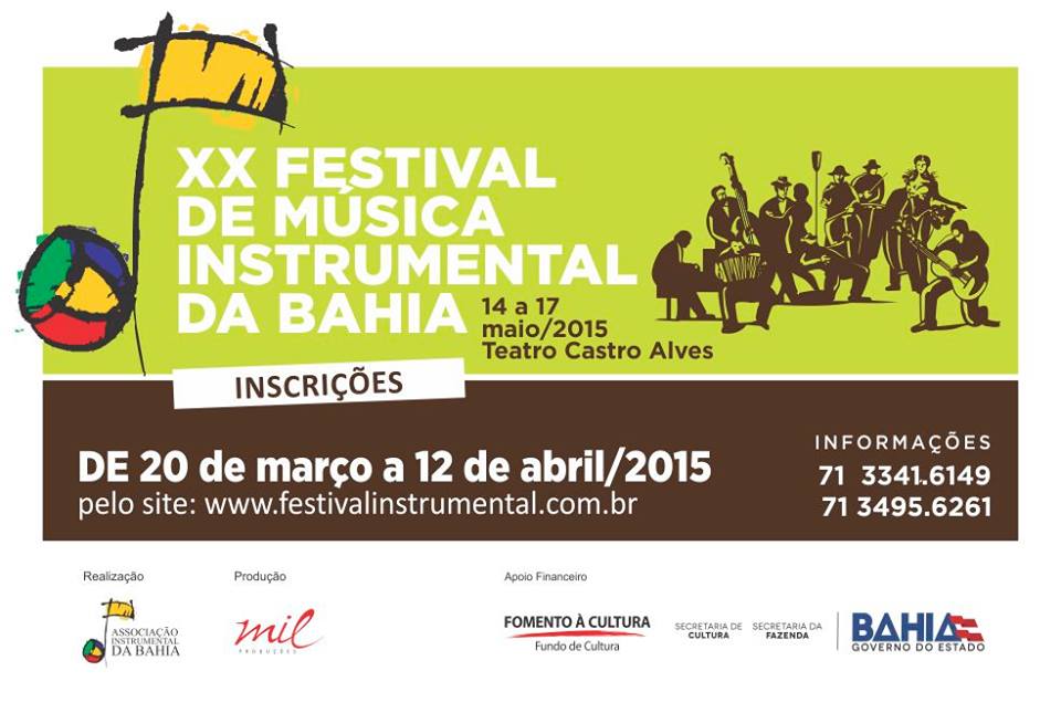 Inscrições abertas para o XX Festival de Música Instrumental da Bahia Onde: http://festivalinstrumental.com.br Quando: até 12 de abril Informações: 71 3341-6149/3495-6261