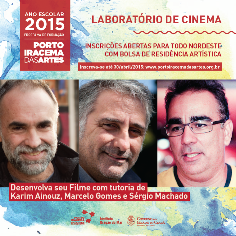 Estão abertas, até 30 de abril de 2015, as inscrições do Laboratório de Audiovisual - Cinema, do Porto Iracema das Artes - Escola de Formação e Criação do Ceará, dando a oportunidade para que seis projetos de longa-metragem, sendo quatro do Ceará e dois dos outros estados do Nordeste, sejam acompanhados e orientados por diretores com trajetória consolidada. A terceira edição do LabCinema continuará com a orientação dos cineastas Karim Aïnouz (Praia do Futuro / O Céu de Suely / Madame Satã), Marcelo Gomes (O Homem das Multidões / Viajo porque preciso, Volto porque te amo) e Sérgio Machado ( Cidade Baixa / Abril Despedaçado - roteirista) que desde 2013 coordenam o Centro de Narrativas Audiovisuais do Porto Iracema das Artes – CENA.15.