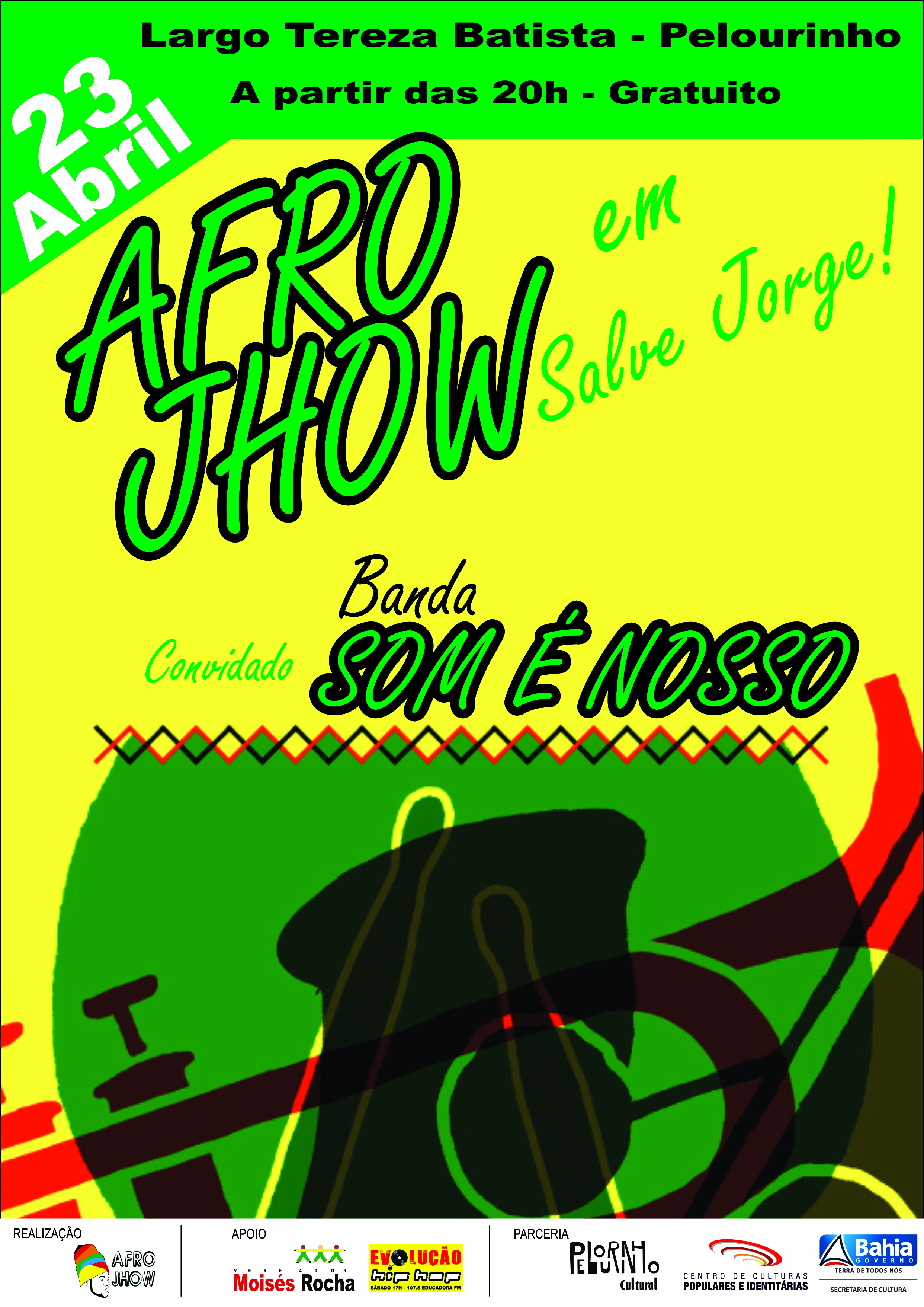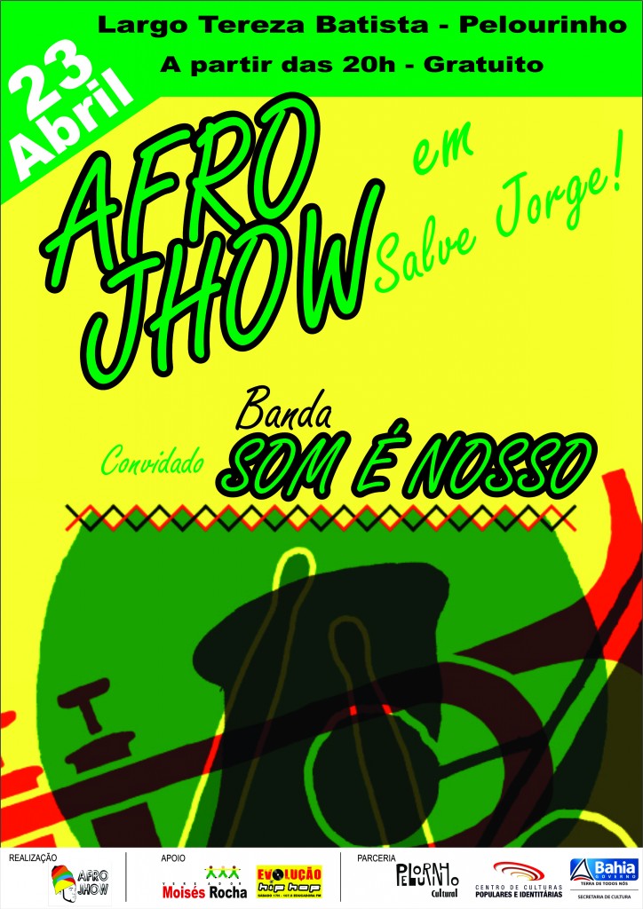 Afro Jhow faz show em homenagem ao dia de São Jorge, santo padroeiro em diversas partes do mundo. Celebrando uma nova fase do seu projeto, que será lançado no inicio do segundo semestre, trazendo várias releituras de músicas dos blocos afros da Bahia. E no dia 23 de abril, o rapper se apresenta em Salvador, no Largo Tereza Batista - Pelourinho, mostrando um pouco do que virá de novidades para o cenário musical da Bahia. Alem de contar como grande convidada da noite, a banda Som é Nosso. Abrilhantando a noite com muito swingue e um repertório que passeia por Munir Hossn, Jailton Dendê, Caetano Veloso, Carlinhos Brown entre outros. Afro Jhow como artista local, faz questão de introduzir nos seus shows, a diversidade e influencias rítmicas, que nos permitem a viajar, e sentir a energia do ritmo caliente latino, a riqueza ancestral da música africana, dentre outros que o artista sente se a vontade para introduzir suas poesias. Aguardem uma noite com shows dançantes, muito enérgicos, espalhando muita energia e auto estima para todos os lados. SERVIÇO: SHOW: Afro Jhow "Salve Jorge" / Convidado: Banda Som é Nosso Data: 23 de abril - Quinta Feira Horário: 20h Classificação: Livre Local: Largo Tereza Batista - Pelourinho – Salvador – BA Acesso: Gratuito