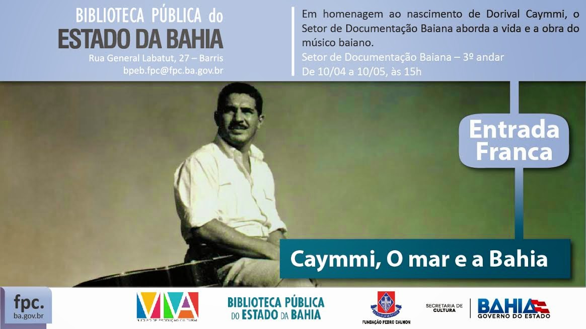 Em homenagem ao nascimento de Dorival Caymmi (30/04), o Setor de Documentação Baiana da Biblioteca Pública do Estado da Bahia apresenta a mostra Caymmi, o Mar e a Bahia, abordando a vida e a obra do músico baiano, de 10 de abril a 10 de maio. A entrada é franca.