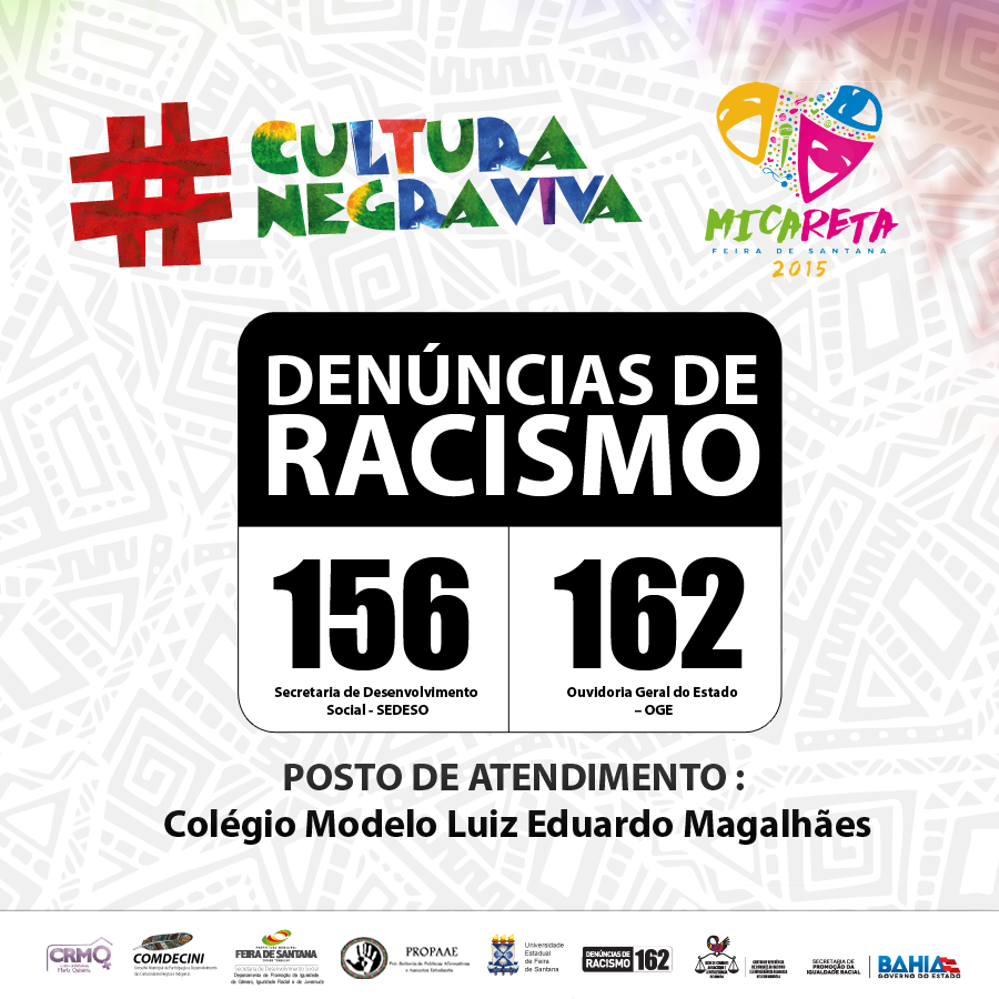 Durante os quatro dias de Micareta o público flutuante no município pode chegar a mais de 1 milhão de pessoas, de acordo com a estimativa da Polícia Militar. Os turistas e feirenses contarão, neste serviço, com a equipe multidisciplinar do Centro de Referência de Combate ao Racismo e à Intolerância Religiosa Nelson Mandela, que funciona na capital e oferecerá orientações e acompanhamento dos casos por meio de apoio social e jurídico. As denúncias também podem ser direcionadas ao Ligue 162 (Ouvidoria Geral do Estado – OGE) e ao Ligue 156 (Secretaria Municipal de Desenvolvimento Social - Sedeso), serviços de ligação gratuita.